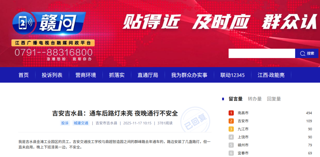 《赣问》平台转来的《吉安吉水县:通车后路灯未亮夜晚通行不安全》已收悉。