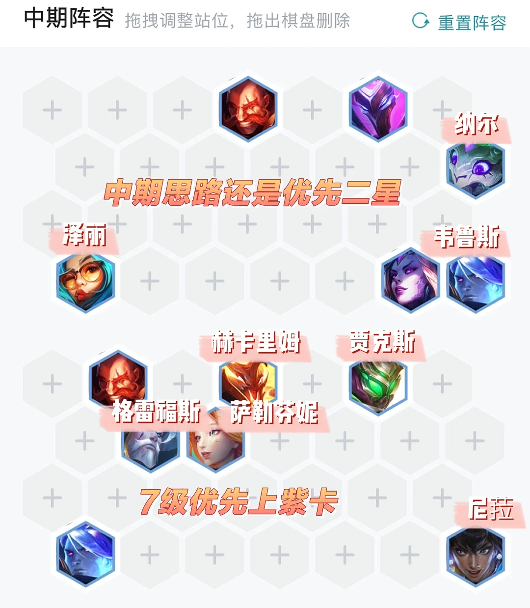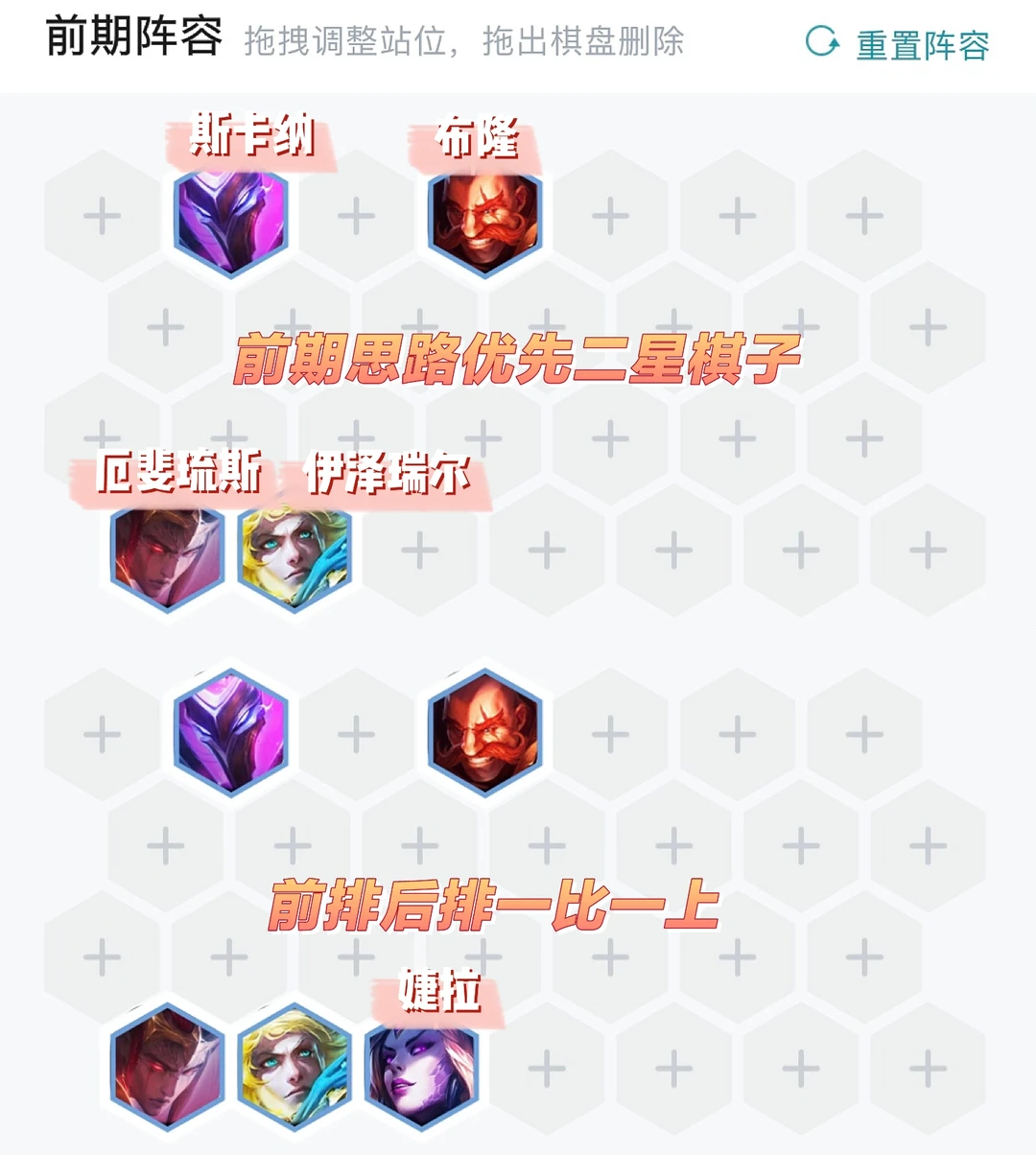 前期思路就是前排和后排尽量对等上怪,卓尔本身全体都有一定输出和坦度,只要不走极端全上肉或者全输出,都是容易连胜的,旗子方面优先上二星旗子,根据嫖牌来定夺。