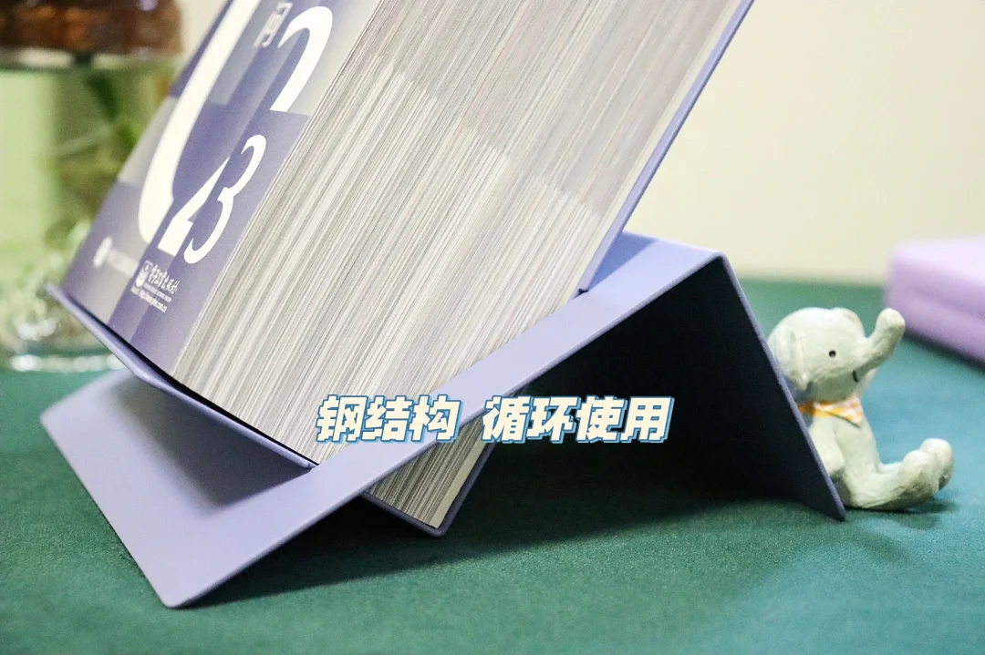🔍钢结构支架。2块钢结构支架组合成了日历的支架,显得很高大上,往家里一摆既美观精致又实用,专利产品、循环使用、环保力up,既可当手机支架又可做书立。