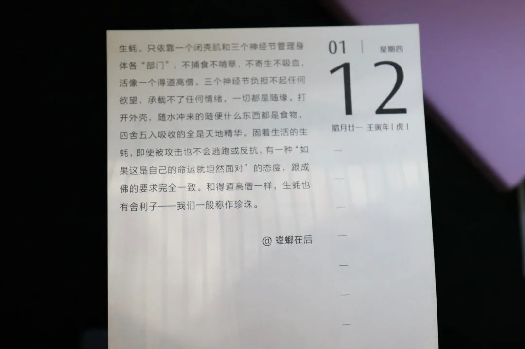 ❤️日历非常重要,它能够为平平无奇的生活营造一点仪式感,所以每年年末我都有买日历的习惯,撕掉一页的时候,给自己几秒钟的时间回顾昨天有没有白过?是否做了一点有意义的事情?