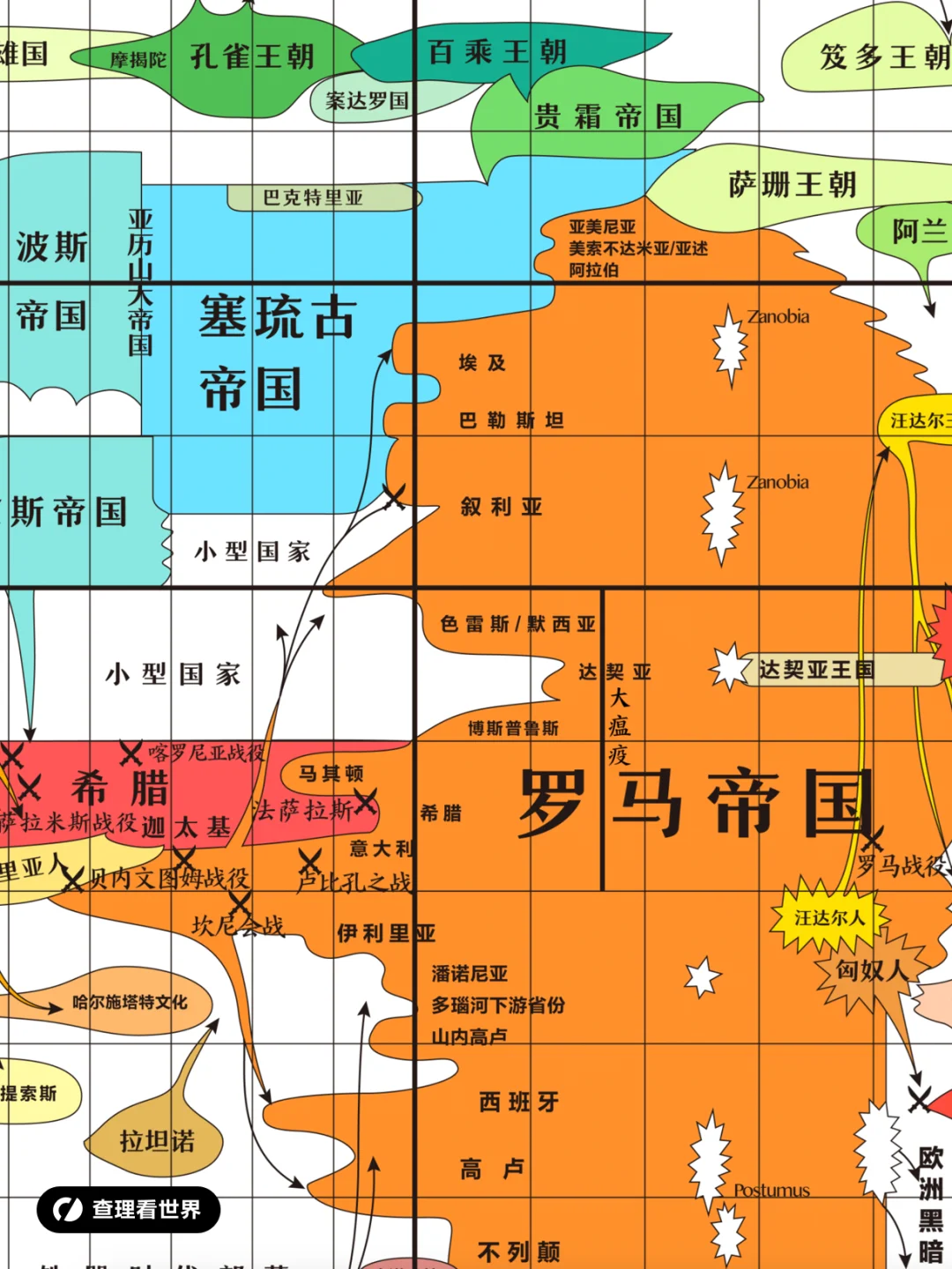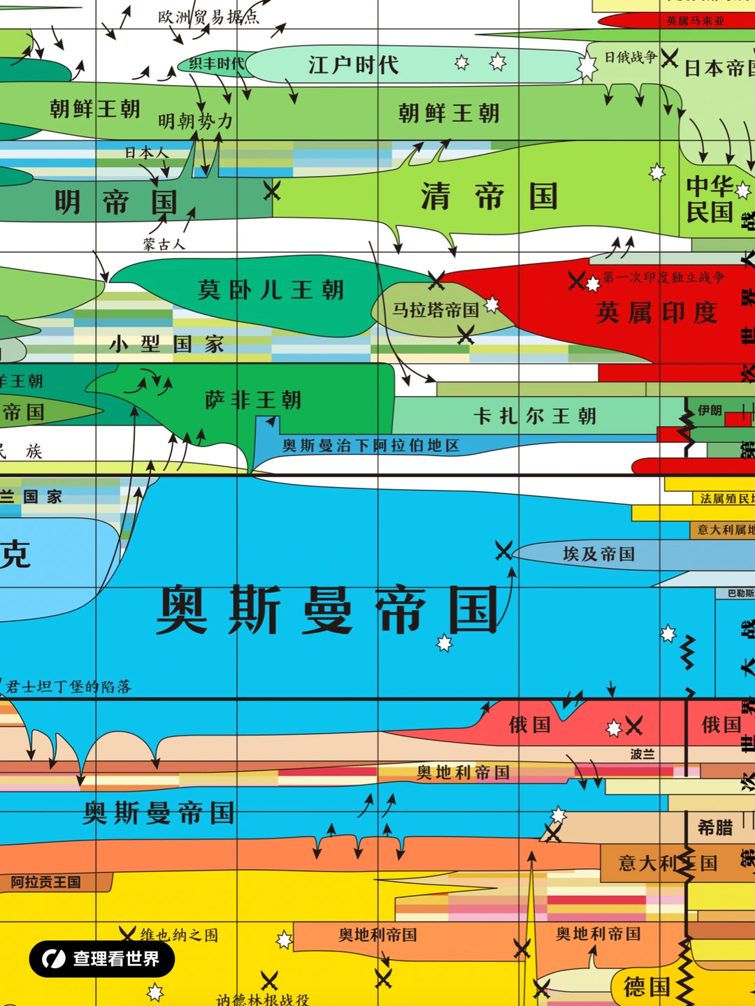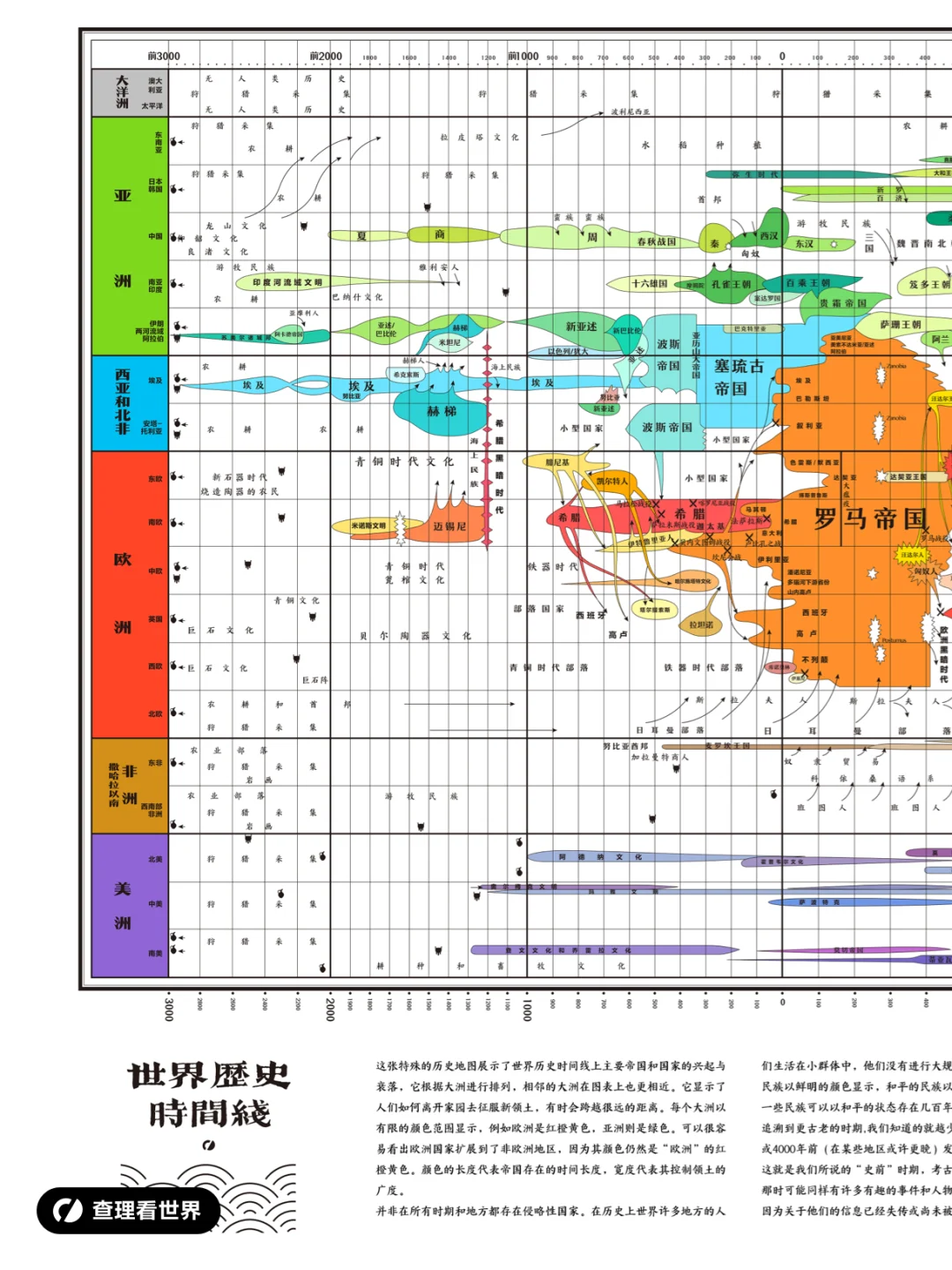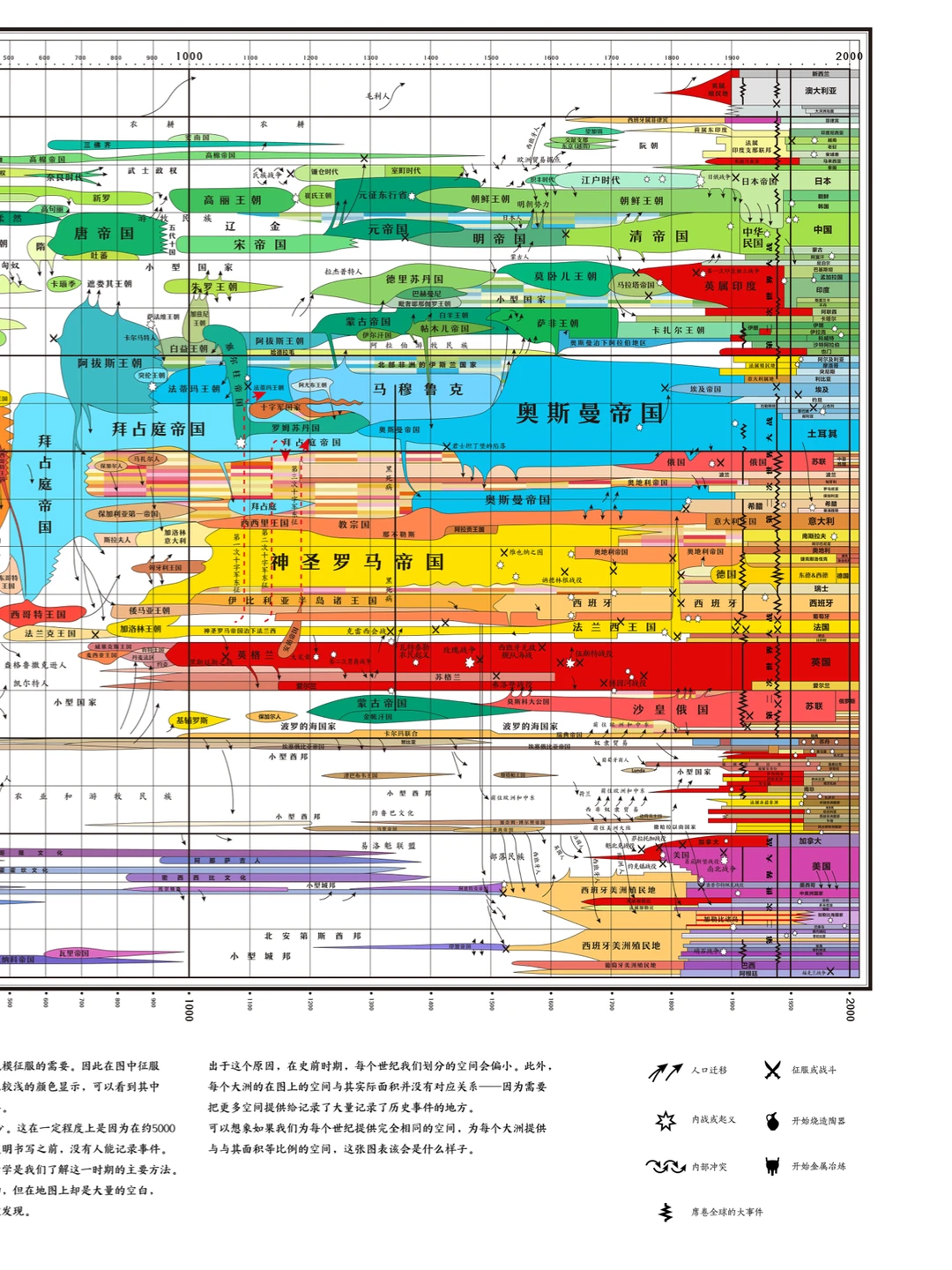 这张特殊的历史地图展示了世界历史时间线上主要帝国和国家的兴起与衰落,它根据大洲进行排列,相邻的大洲在图表上也更相近。它显示了人们如何离开家园去征服新领土,有时会跨越很远的距离。每个大洲以有限的颜色范围显示,例如欧洲是红橙黄色,亚洲则是绿色。可以很容易看出欧洲国家扩展到了非欧洲地区,因为其颜色仍然是“欧洲”的红橙黄色。颜色的长度代表帝国存在的时间长度,宽度代表其控制领土的广度。 并非在所有时期和地方都存在侵略性国家。在历史上世界许多地方的人们生活在小群体中,他们没有进行大规模征服的需要。因此在图中征服民族以鲜明的颜色显示,和平的民族以较浅的颜色显示,可以看到其中一些民族可以以和平的状态存在几百年。 追溯到更古老的时期,我们知道的就越少。