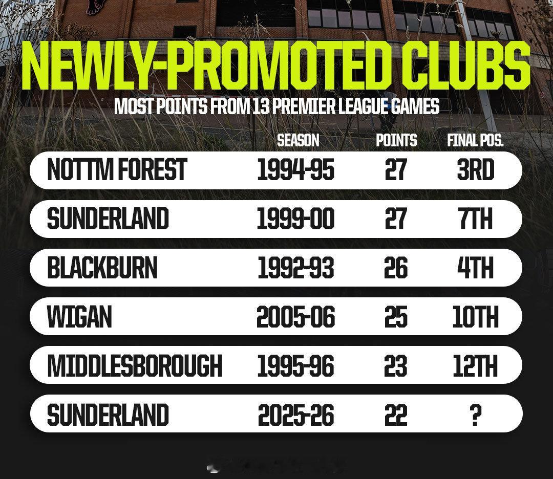 【黑猫+黑马】英超赛季赛程刚过三分之一,桑德兰是最近20年英超联赛成绩最好的升班马球队,13轮联赛抢下了22分。上一支让人印象深刻的升班马球队,是2005-06赛季维冈竞技,13轮抢下25分。