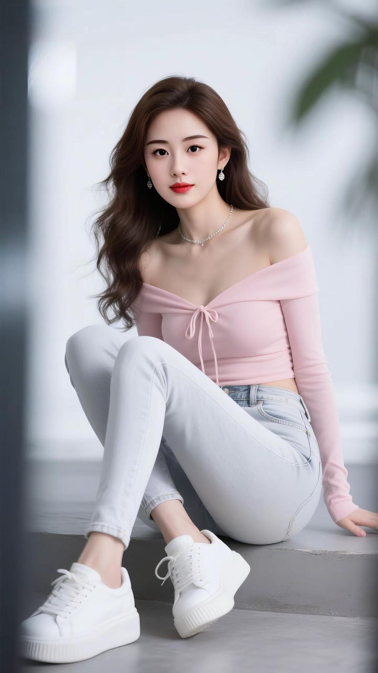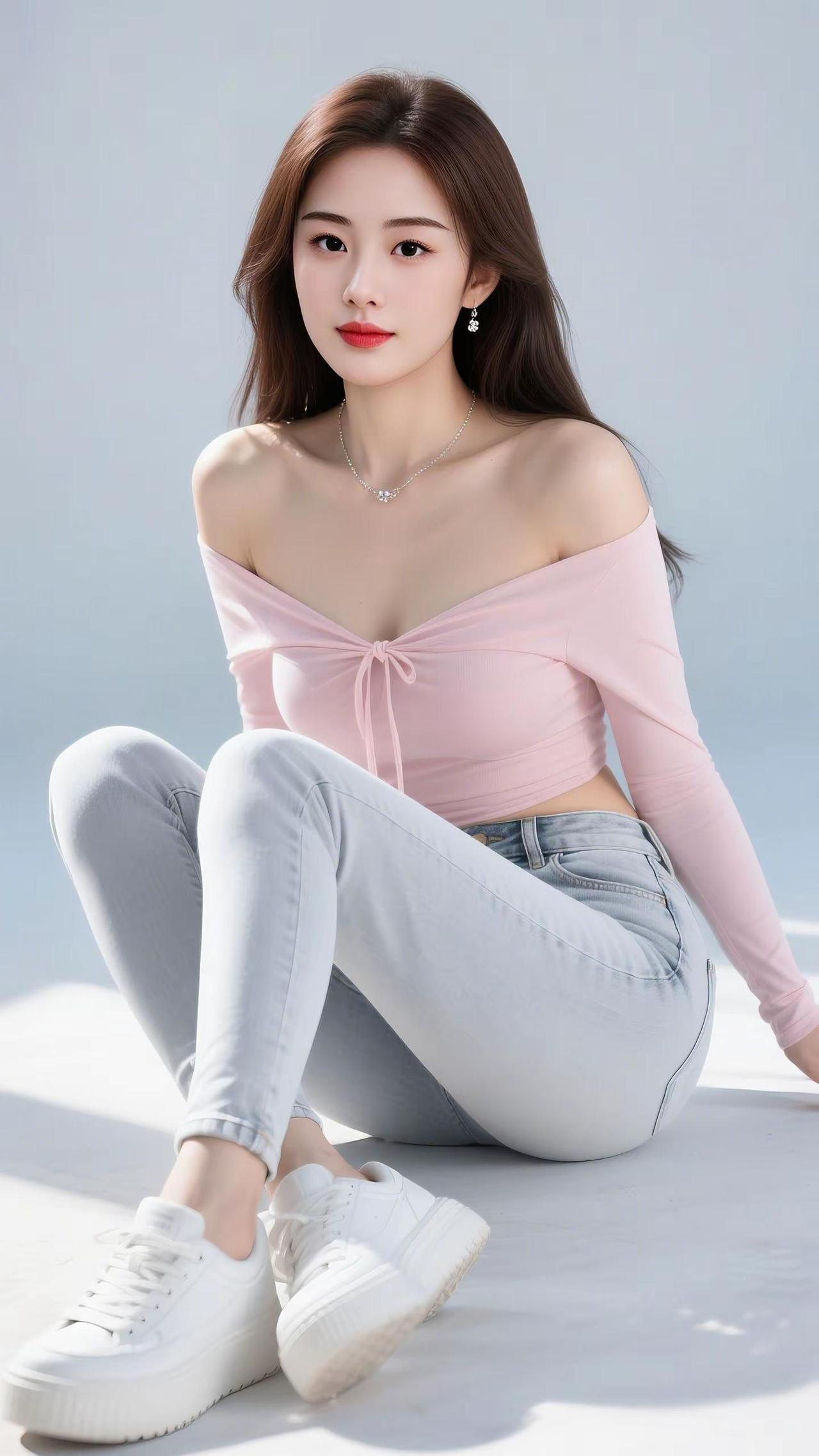 清新夏日穿搭,白色露肩上衣搭配牛仔短裙,坐在柔软的地毯上,享受悠闲时光。