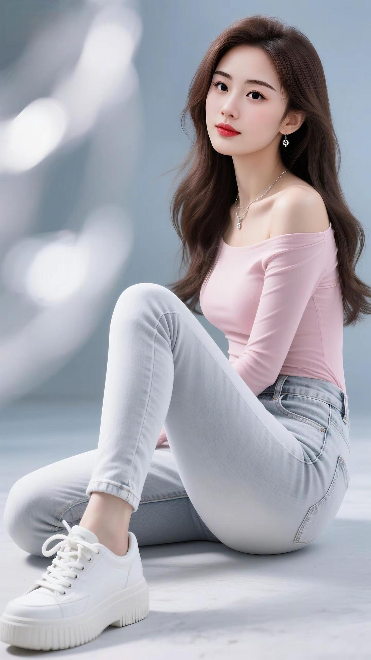 蓝色紧身牛仔裤搭配长袖上衣,简约又时尚,完美展现身材曲线!