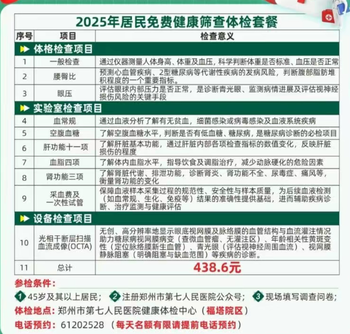 据介绍,本次推出的免费筛查套餐总价值438.6元,涵盖体格检查、实验室检查、设备检查三大类10项核心项目,全面覆盖心血管疾病、代谢性疾病、眼底疾病等关键健康维度。具体检查内容及意义如下图: