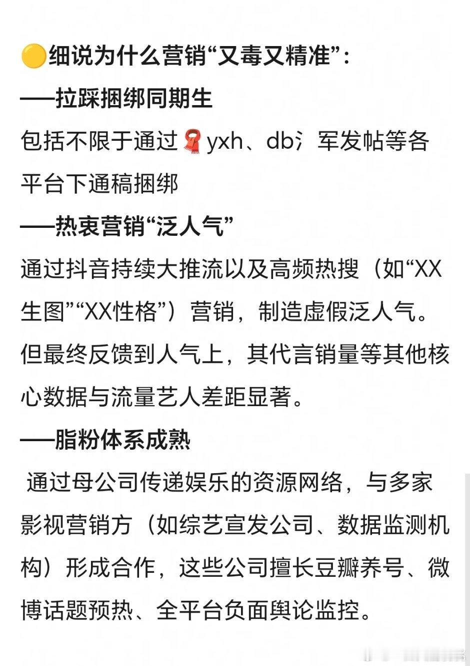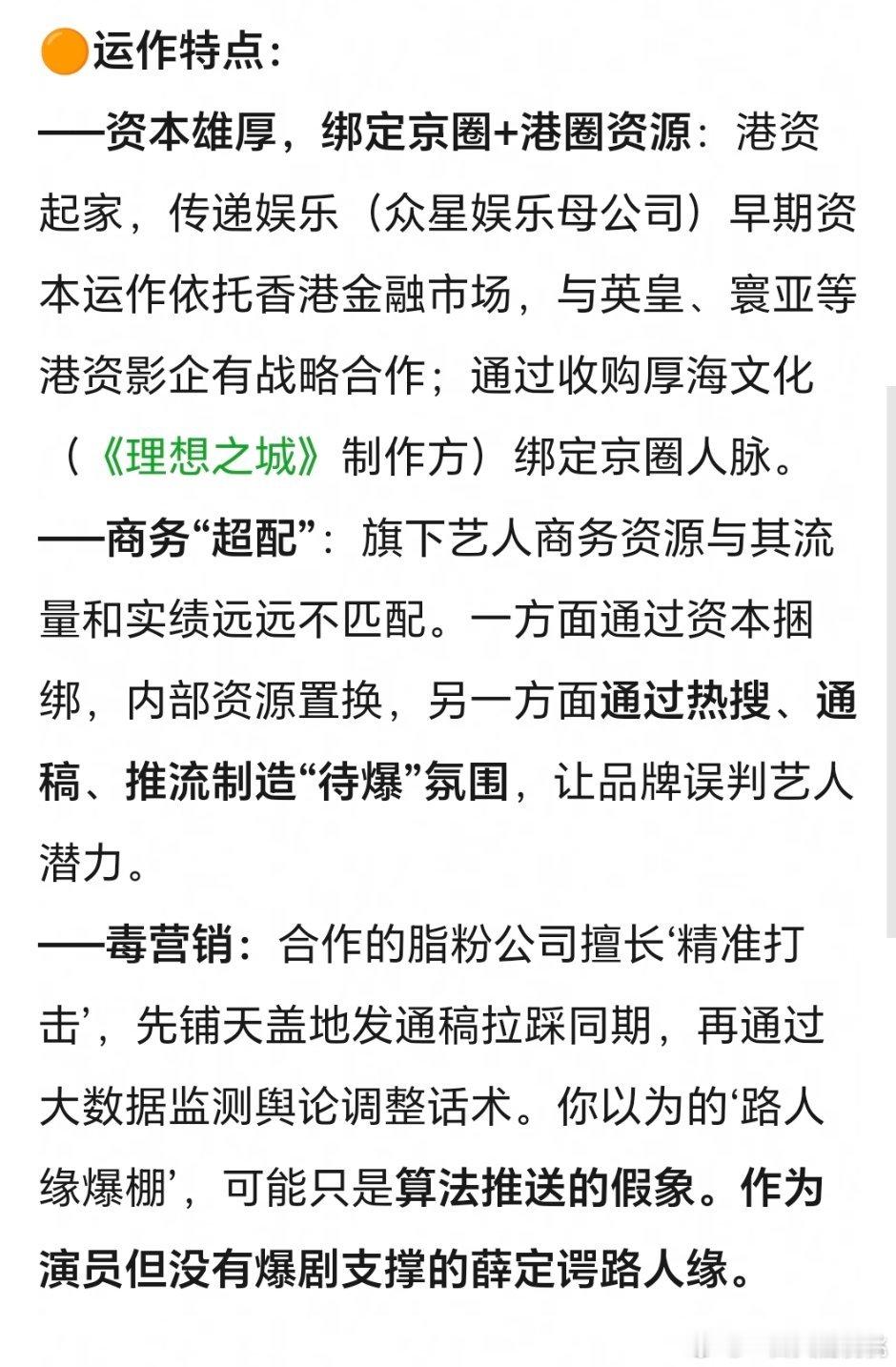这是瓣儿分析的众⭐这个公司特色毒yx是对于别家来说的,对自己艺人来说就是成功的啊,通过大yx和sw打造泛人气这点算比较成功的娱乐公司了,就是转化不了几个亖忠,因为公司把一切打点的太妥当了不够虐,所以吸不到太多亖忠粉,各有利弊吧,适合想要躺平的艺人