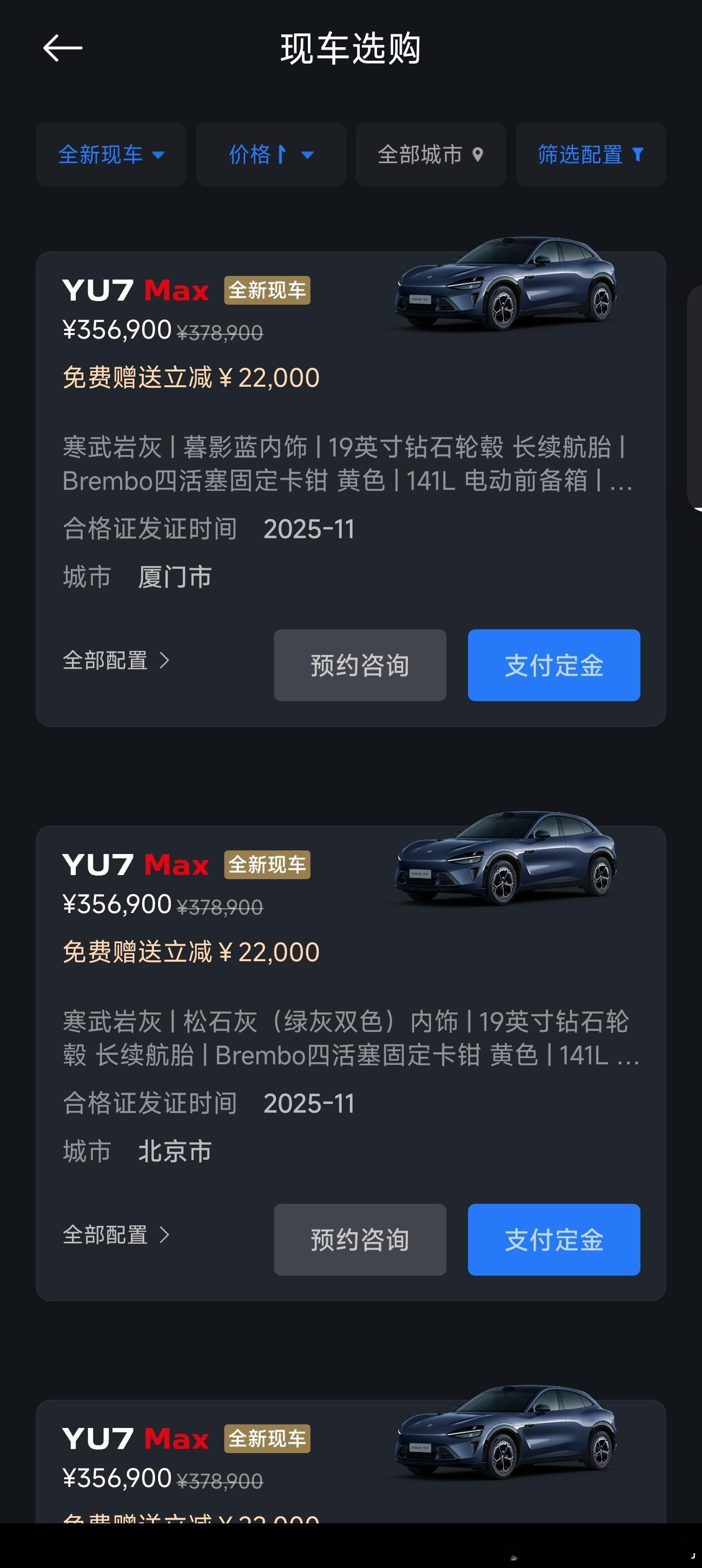 小米今天开放了现车选购,现在才开放了十分钟,但是展车显示是没有车源的,不知道是不是卖完了。全新现车倒是有很多,但基本都是比较奇怪的配置,看似调光天幕、25扬声器都选了,却搭配着19寸轮圈,属于似满配非满配,怪不得原车主不提了。小米汽车现车选购功能开放新能源汽车小米汽车