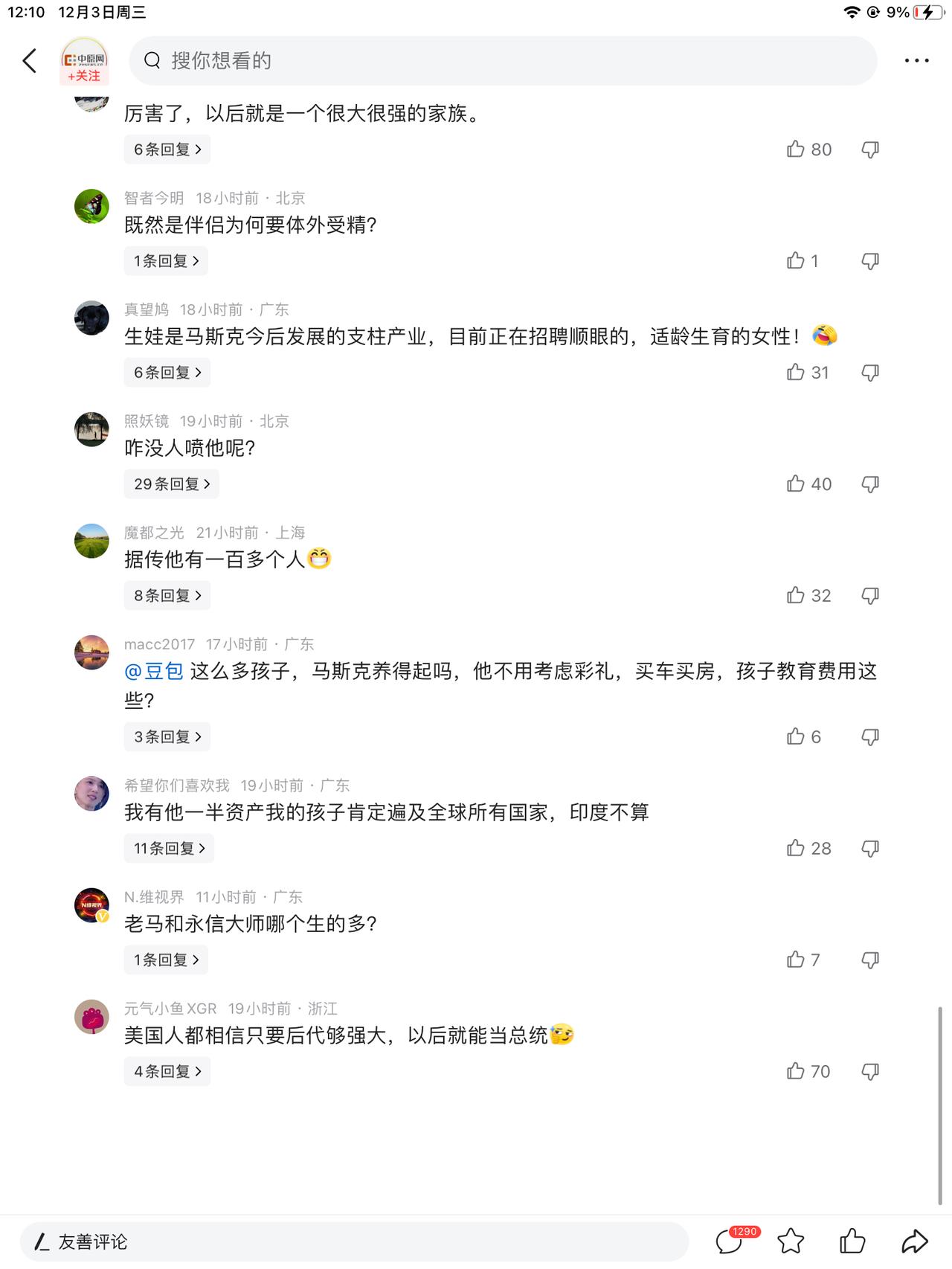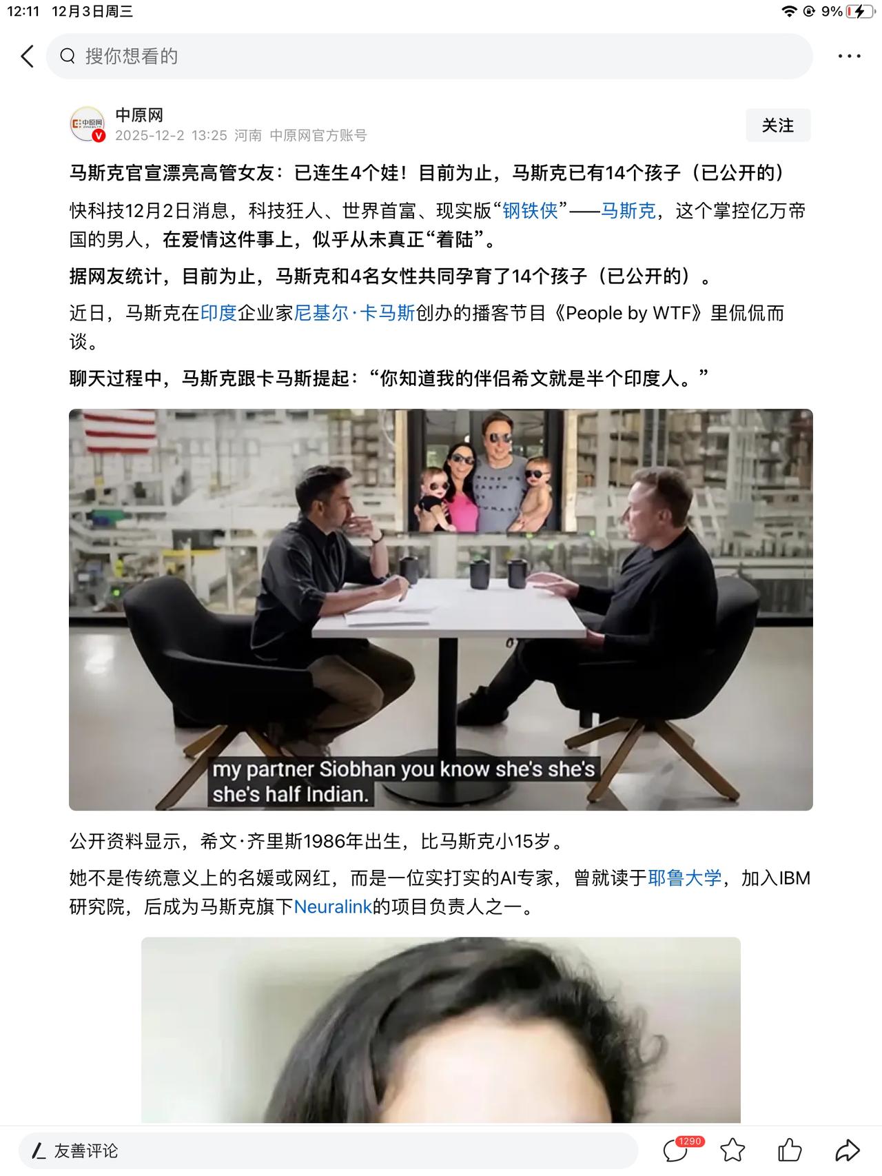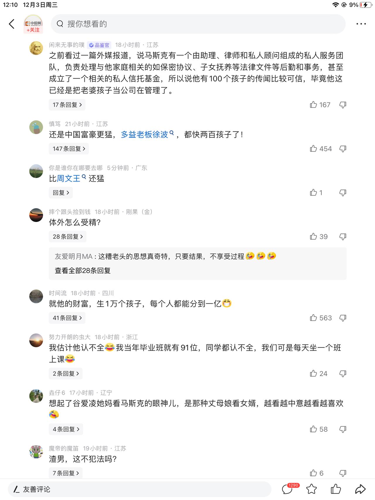 马斯克公开他的女友,高管。连生四个娃,不用自己出力,体外受精,听着好像也不是试管。具体咋操作的,恐怕有些难度。这就不过度赘述了。 有这种好事,自己不亲自参与一下,抹掉了中间快乐的过程。这事儿,只有马斯克能做出来。 说那个咱中国有个徐老板,子嗣接近两百个。妈呀,真没累死也是挺神奇的。亲力亲为的? 有人想起了谷 爱凌的妈妈,看向马斯克的眼神。像那什么丈母娘看女婿的眼神。你别说,如果能联姻,她妈妈估计,猜测啊,很大程度上,能接受, 那是整个地球上,第一有钱,又舍得给女生花钱的男人。当然,女方也有钱。但架不住基因好啊! 你看图一的小屁孩,是不是挺可爱的?哈哈。真是的。小嘴儿咧着,好像在说我的童年没有烦恼。首富 马斯克