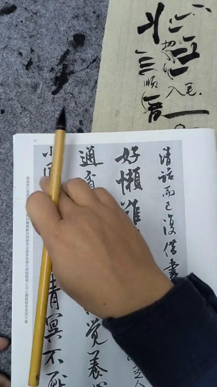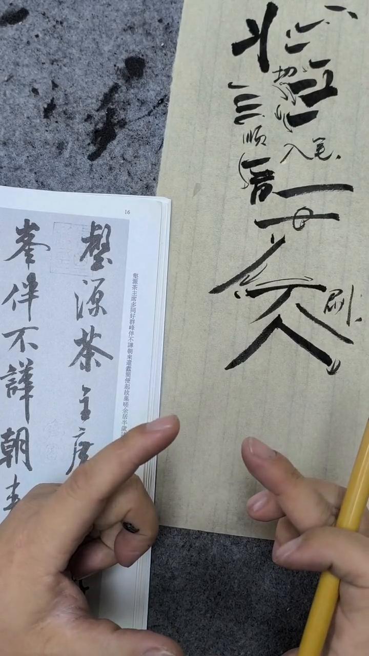 米芾《苕溪诗帖》笔法特点第2课。 这种横着的也有,横着这种笔画也有,也会有,像这个圆字板这里就出来了。这种其实也是逆风,它会看得到一点这种笔画。这个人像这个,它可以看到一些笔画,又看到一点笔画,那以后它从上面下来,下面这里的时候就是顺的这种笔画进来,顺的进来到下面这个连接的时候有点腻的这种就变成方了。 这些去入笔的时候就要注意这些用笔怎么去用,因为写的时候尽量要写着像另外一个就是行笔的时候有些笔画都会比较快的,写的比较快那个长横,有些中间会刷的出来那种,有些会留白的出来那种感觉,像眉毛一样。 还有这个撇,你看这个笔只是从上面这个笔起笔就直接切下来了,切下来了,这个就没有把笔锋长就切下来,下来很快的这种,这个很快,这个布置的很快,再从这里切,带着弧度走,笔画是很快的刷出来,以后从这边回来从这边下来再写这个撇,这个也是刷出来的,很快的笔画走。 上面这个茬子是不是?你看这个撇捺,这个很快的不要下来,你看它这尾巴收的很,收的很方的这种就停在这个地方,它就起这个就是刷的这个动作了,就是它的特点了。 另外刚才说的那个还有一个就是它那个笔画会有些会有个外拓的那种,你看它这种笔画很短可能看不出来但它其实也是有的,包括这个筒子,这个筒子你看它这个竖画,它是它这说话不是很直,它会有感觉有几段,但是它就是一个外拓的这种感觉。 它包括这个后外面的这个右边这个数字也是一样的,带着圆的那种,这个谱子也是一样,这个音质就看的明显了,是不是?这音质就看的明显了,它就是一个逆风,我一般要顺逆风起,起来之后这边也是一样顶上去,这个地方下来,其实在这个地方就是一个转的地方,一个转轴的转轴的地方笔画下来,往这边走,就这种感觉。 由它里面打笔画这种,它里面这个字里面其实很笔画都是都是偏逆风起笔走的,起来,再起来,把盖住,收笔的时候也是一定要注意,