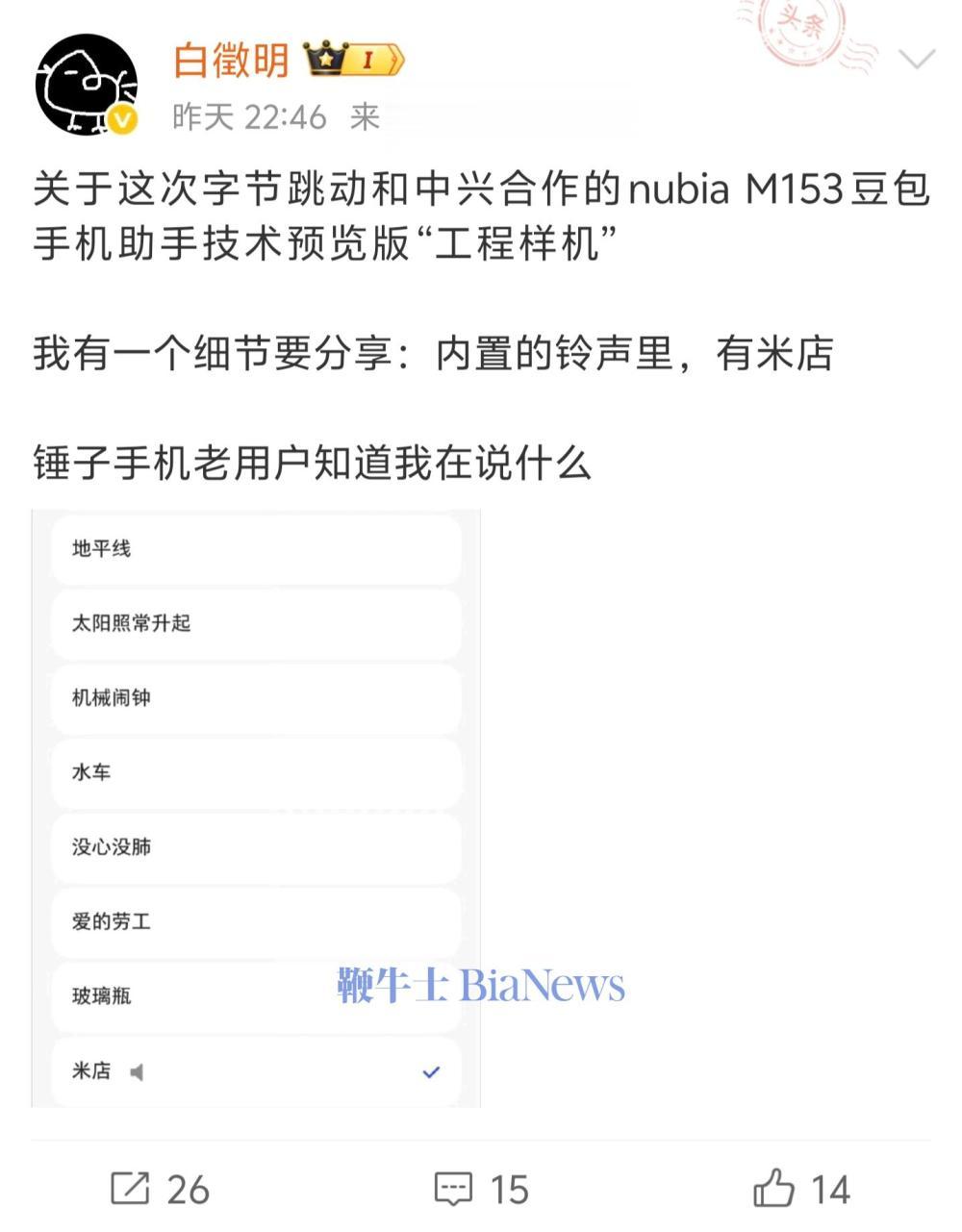 此前,12月2日,博主@白徵明发现,该机内置的铃声当中有“米店”铃声。据悉,铃声“米店”是锤子手机的内置手机铃声之一。
