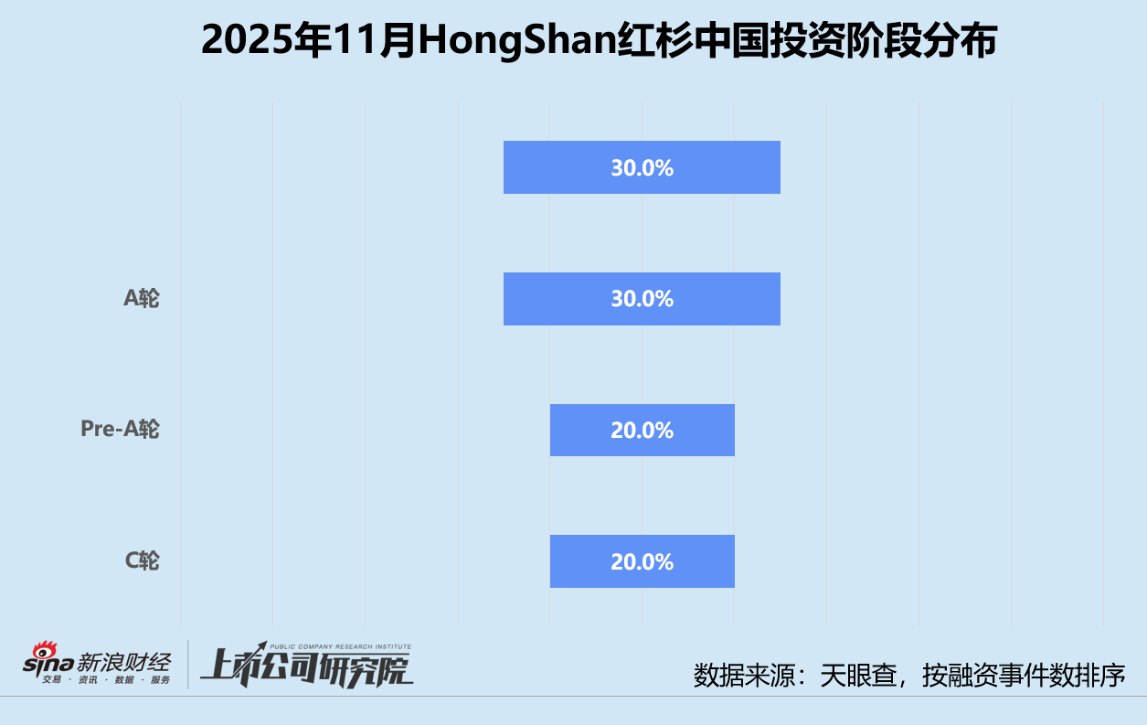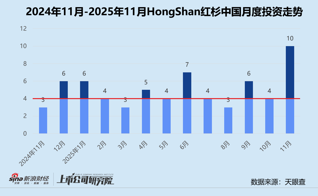 统计区间内,红杉中国公开披露的股权投资事件共10起,与10月相比显著提升150.0%,较2024年同期翻了3倍有余,创下过去13个月峰值。往期数据显示,红杉中国月均投资事件数长期维持在3-7起波动区间,节奏相对平稳,11月投资节奏加快,或说明机构对当前市场的“机会窗口”判断更积极,选择集中布局落地。