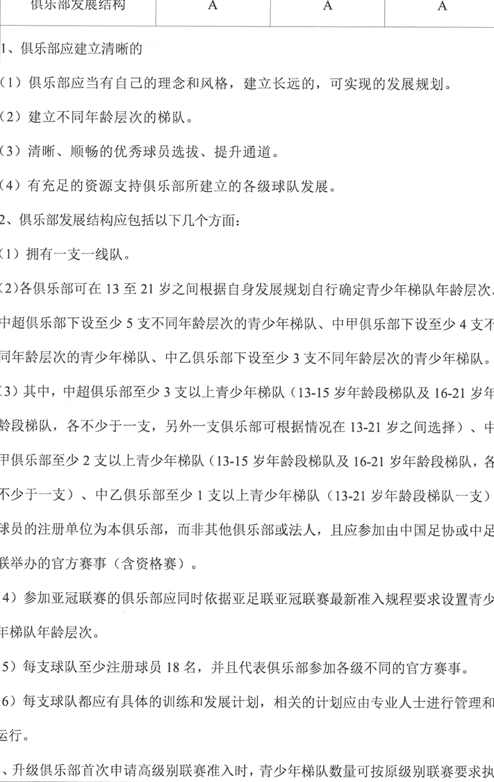 中超俱乐部至少3支以上青少年梯队(13-15岁年龄段梯队及16-21岁龄段梯队,各不少于一支,另外一支俱乐部可根据情况在13-21岁之间选择)
