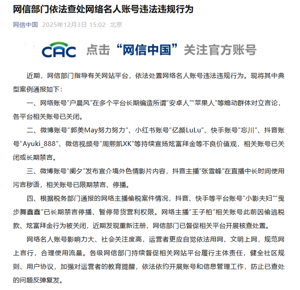 据“网信中国”微信公众号12月3日消息,近期,网信部门指导有关网站平台,依法处置网络名人账号违法违规行为。现将其中典型案例通报如下:
