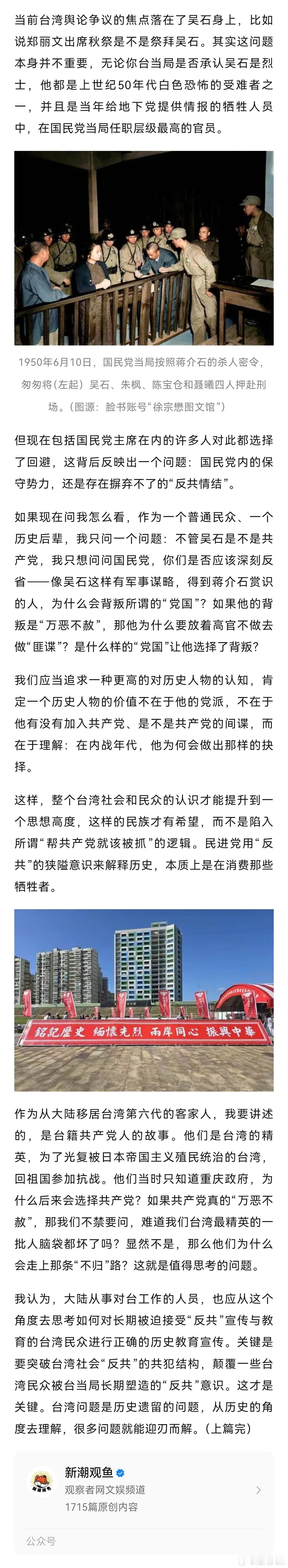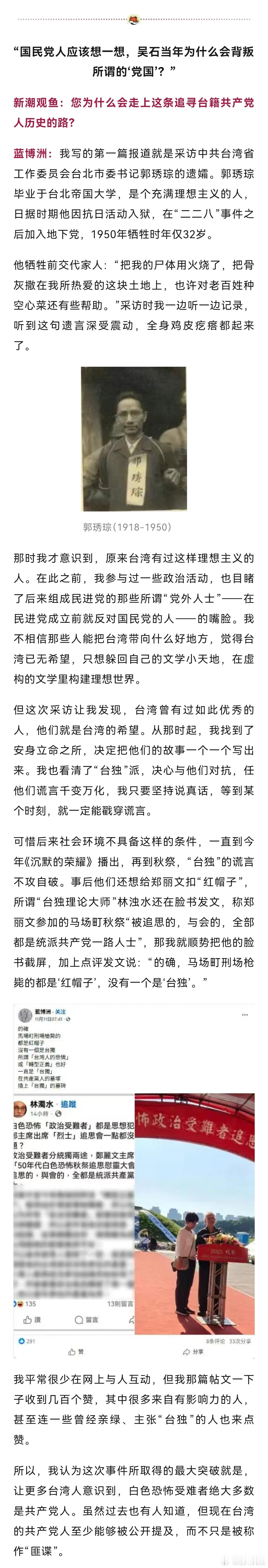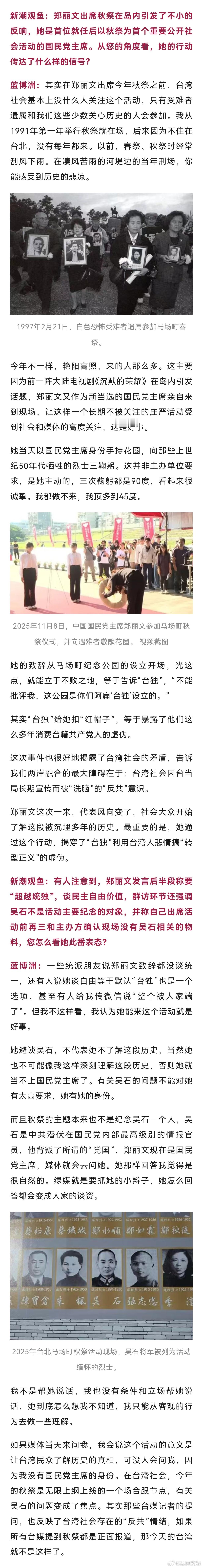 【马场町秋祭那天,郑丽文对他说了句闽南话】蓝博洲谈郑丽文出席马场町秋祭近日,独家对话台湾作家蓝博洲。前不久,在台北马场町纪念公园举行的白色恐怖受难者秋祭活动中,中国国民党主席郑丽文与台湾作家蓝博洲时隔多年再度互动。蓝博洲透露,当天在现场,郑丽文看到他,用闽南话跟他说“我要找你”。而郑丽文对烈士的90度三鞠躬,并非主办单位要求,是她主动的。蓝博洲说郑丽文三鞠躬是主动的蓝博洲认为,郑丽文这次出席秋祭,代表风向变了,社会大众开始了解这段被沉埋多年的历史,最重要的是,她通过这个行动,揭穿了“台独”利用台湾人悲情搞“转型正义”的虚伪。