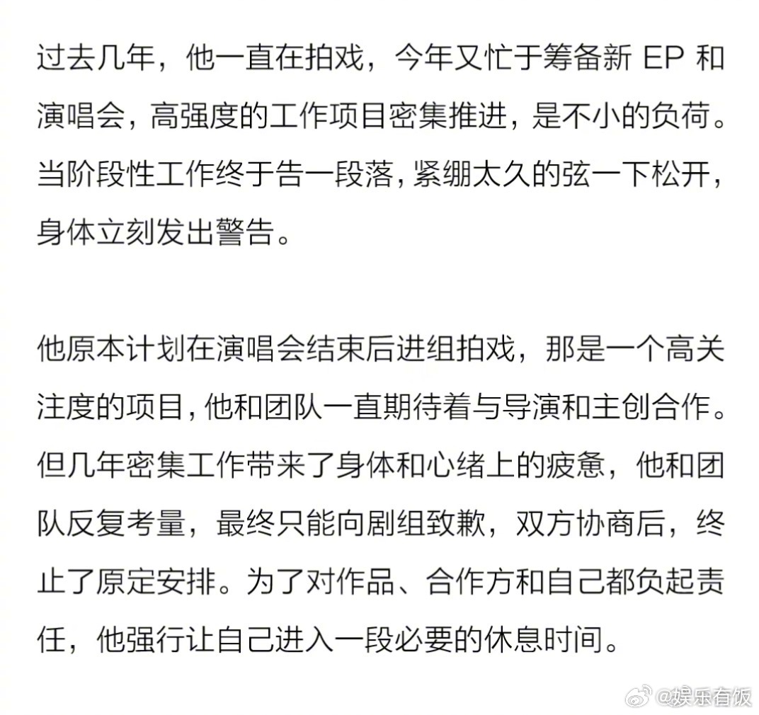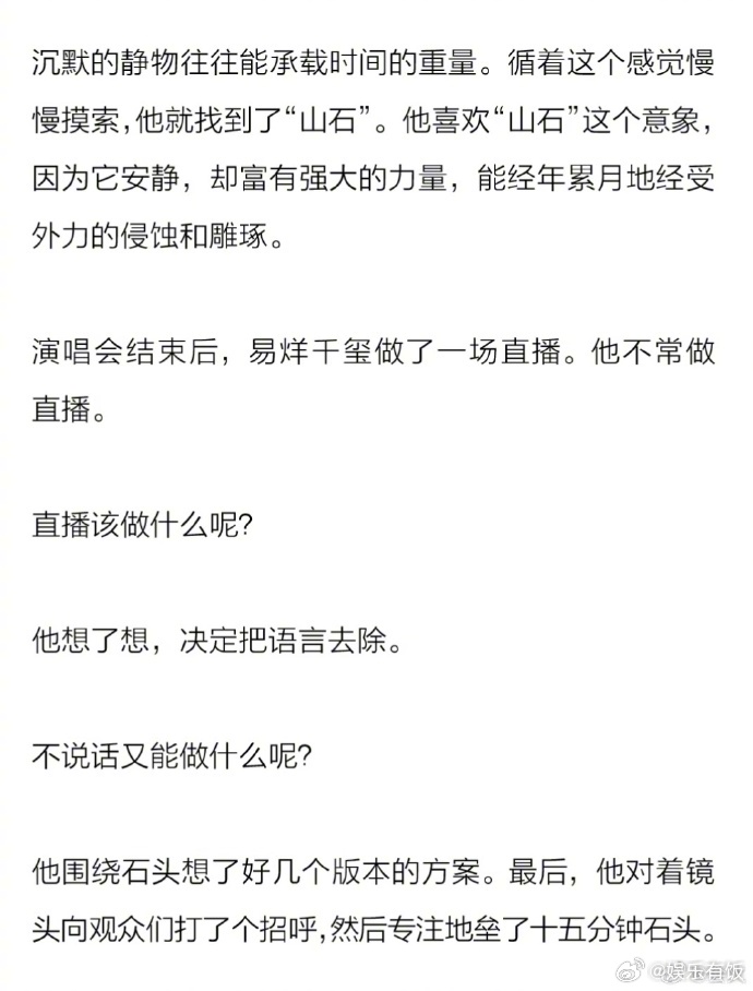 易烊千玺的直播方案是自己围绕石头想的易烊千玺垒石头直播是自己想的 易烊千玺在《伊周》采访中透露,其演唱会结束后原本有进组计划,但因高强度工作带来身体负荷,最终终止了原定的进组安排。与此同时,演唱会后他开启的 “垒石头直播” 也与这段调整期相呼应 —— 该直播方案由他自主围绕 “山石” 意象构思,以 “去语言式” 的十五分钟垒石头环节呈现,既贴合他对 “安静却有力量” 的意象偏好,也侧面体现了其在工作节奏调整期的状态。