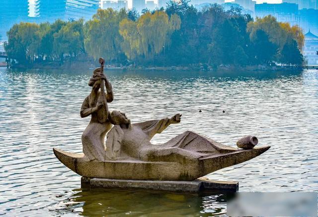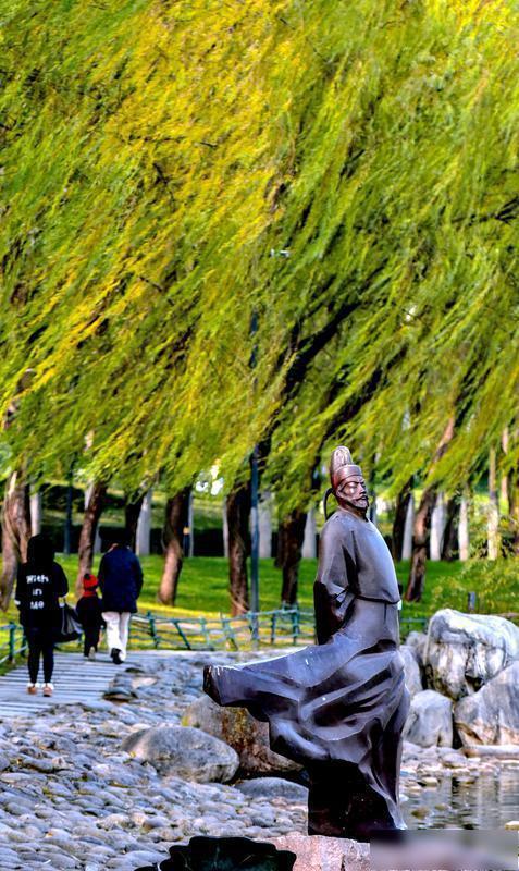 初冬午后,金黄的银杏叶在青石板路上铺成地毯,引领着众人走向那座著名的“醉卧诗人”雕塑。几个孩子正围着雕塑嬉戏,其中一个调皮地摸了摸诗人高挽的发髻——那是杜甫,正以他最自在的姿态,永远醉卧在曲江池畔。