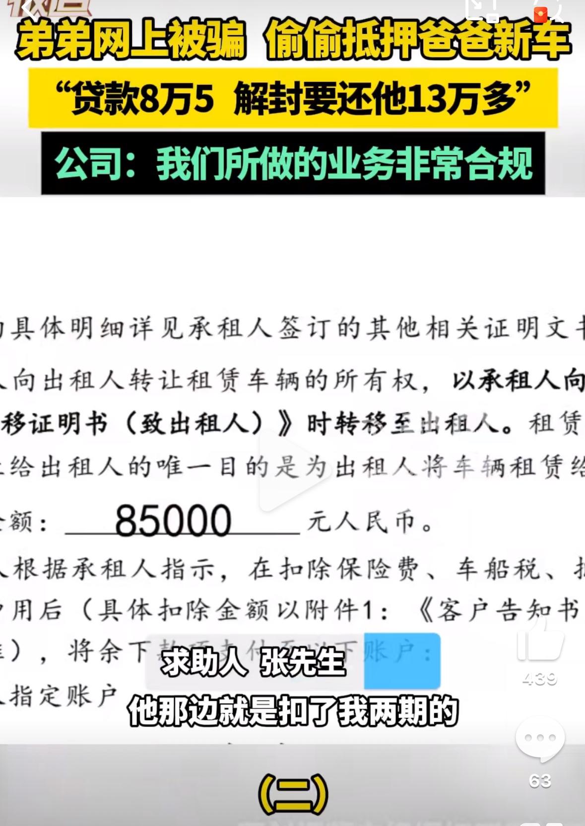 糊涂小舅子抵押14万新车,十几天后赎车费尽翻倍 事情是这样的,河南一小伙小张因投资虚拟币被骗,他背着家人把姐夫买给父亲的14万新车拿去抵押。 最后到手不到7万5,才十几天,想赎回来要13万多”,这令小张姐夫气愤不已! 正常情况下,按照正常的利息解压即可,但是压车公司的算法,解压需要13万,相当于买一辆新车的钱了!经过小张和他姐夫一合计,“相当于是8万5(含GPS费用与两个月租金)把将近15万买的车买走,然后再回租给小张,而且每个月租金近4000元,他两直呼太会玩了”。 最后小张姐夫也认栽,愿意出9.5万把车赎回来,但是抵押公司工作人员表示:“这个数字应该是不行了,再去沟通一下”。 直到目前,抵押公司还未回复是否能赎回车辆,所以说无论是投资虚拟货币还是签署融资租赁合同,都要我们谨慎对待每一个签字,这样才能避免财务陷阱!汽车抵押