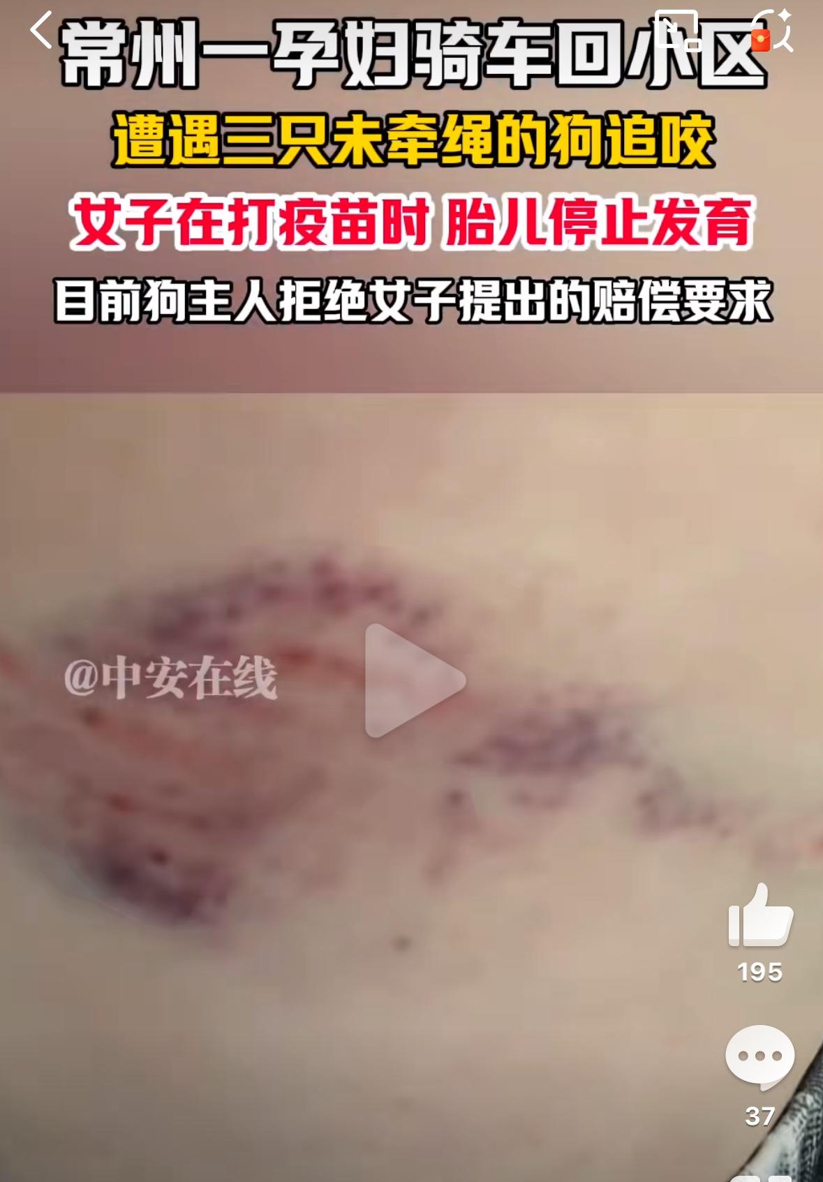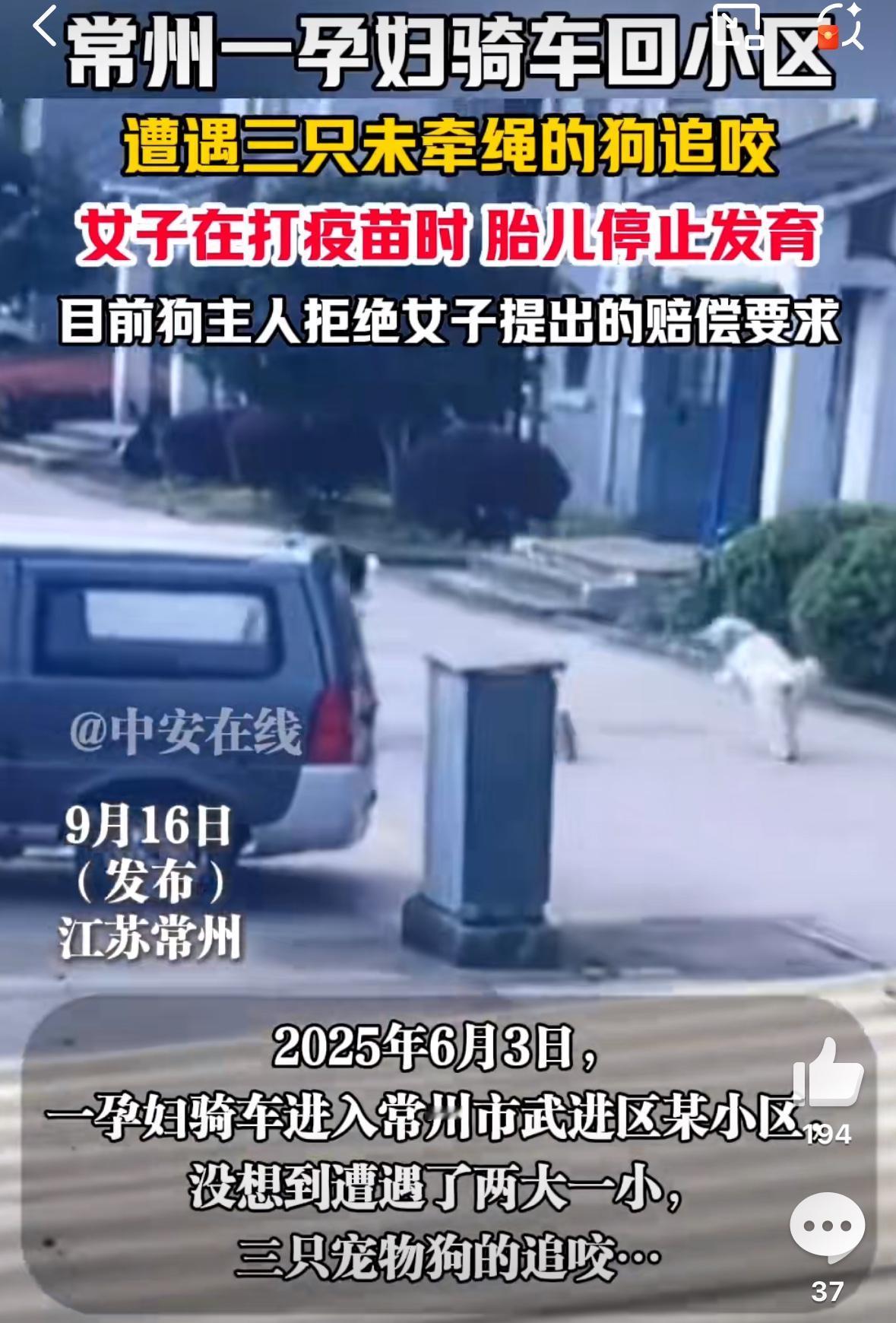 孕妇被未栓绳狗追咬致流产:文明养犬责任不容忽视! 一则令人心痛的新闻近日引发广泛关注。江苏常州一位孕妇在骑电动车时,遭到三只未拴绳宠物狗追咬,导致摔倒受伤并最终胎停。更令人愤慨的是,事发两个多月后,受害孕妇仍未获得合理的赔偿和公正的对待。 今年6月3日上午,常州武进区一小区内发生了这起悲剧。一位怀胎两月的孕妇正骑着电动车,突然遭到两只小狗和一只大狗的追逐扑咬。在惊慌中,电动车失控倒地,孕妇左大腿被犬只抓伤咬伤。最令人无法接受的是,狗主人当时就在现场,却未能及时制止自己的宠物。 事发后,孕妇在家人陪同下立即报警,并前往医院接种狂犬疫苗。然而,在接种第四针疫苗时,她发现腹中胎儿已停止发育。两家三甲医院的诊断结果一致:只能进行药流终止妊娠。这位孕妇痛心表示:“这是期盼已久的孩子,现在每晚都难以入睡。” 更让人心寒的是狗主人的态度。目前狗主人只愿意赔偿8000至10000元,与孕妇的期望相去甚远。事实上,类似案件在其他地区曾有更高额的赔偿,2024年上海一名孕妇被未拴绳的金毛扑倒致流产,最终获赔9万元。 此类案件处理缓慢的主要原因在于:现行法律未明确“间接损害”赔偿标准,法官拥有较大的自由裁量空间,导致案件久拖不决。 这起事件再次为我们提了个醒。饲养宠物是个人权利,但文明养犬更是每个饲养者不可推卸的责任。外出遛狗时必须牵好犬绳,必要时为犬只佩戴嘴套,这些措施不仅能避免纠纷,更是对他人安全的保障。 我们期待此案能够公正解决,也希望这位母亲能够早日走出阴霾。同时呼吁相关部门完善法律法规,让此类悲剧不再重演。 文明社会需要每个人承担责任,别让一时的疏忽,造成他人永远的伤痛。无绳恶狗伤人