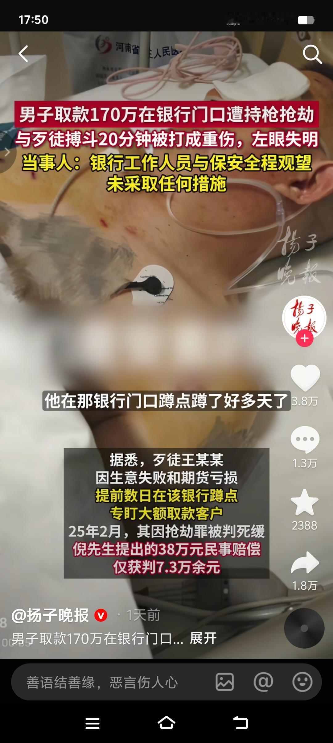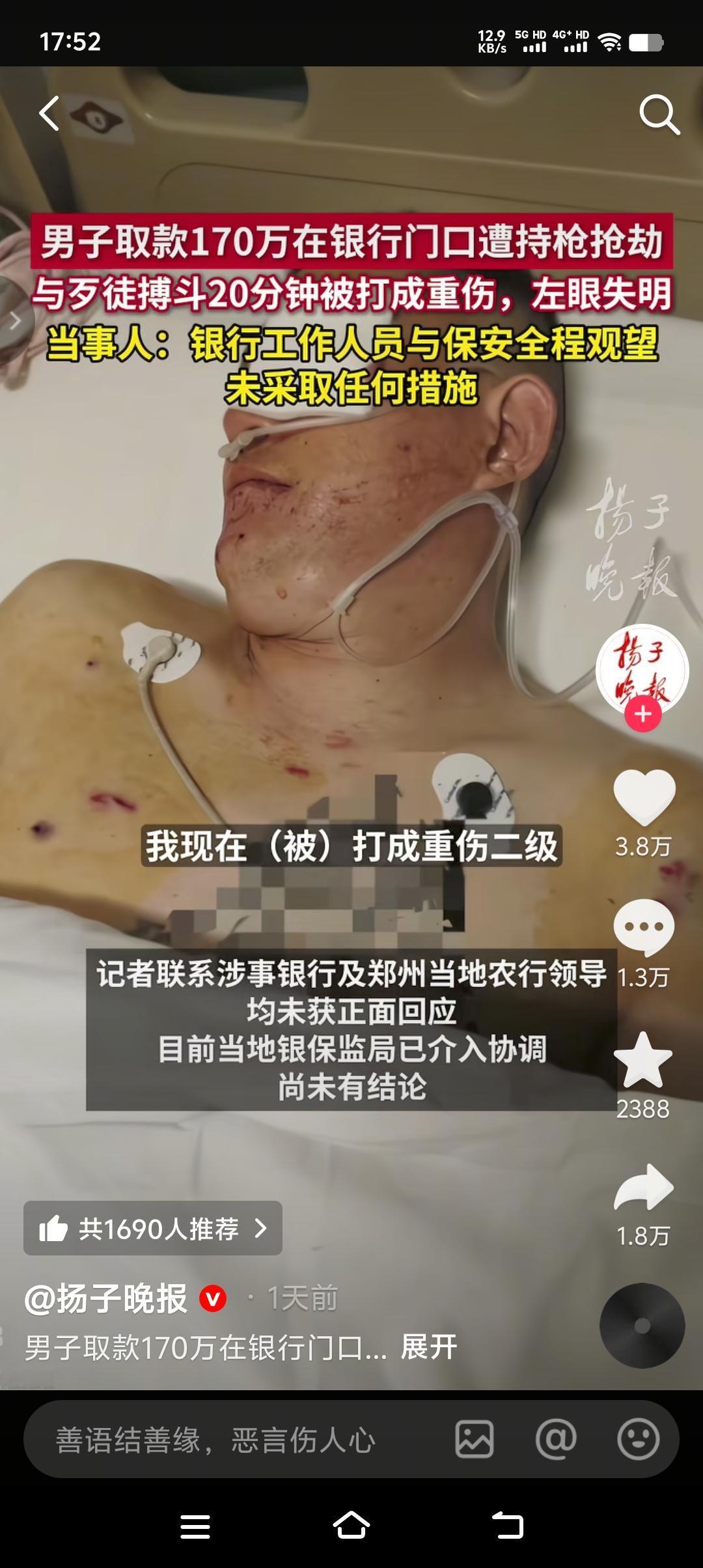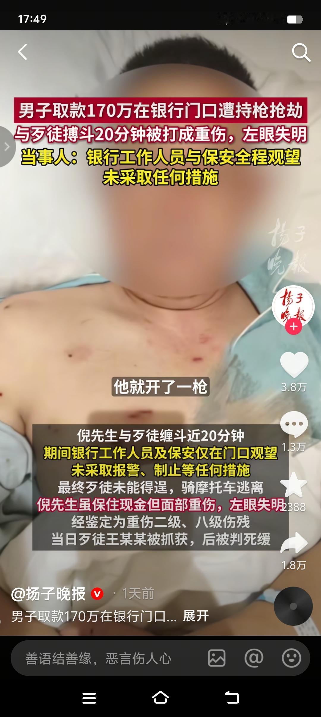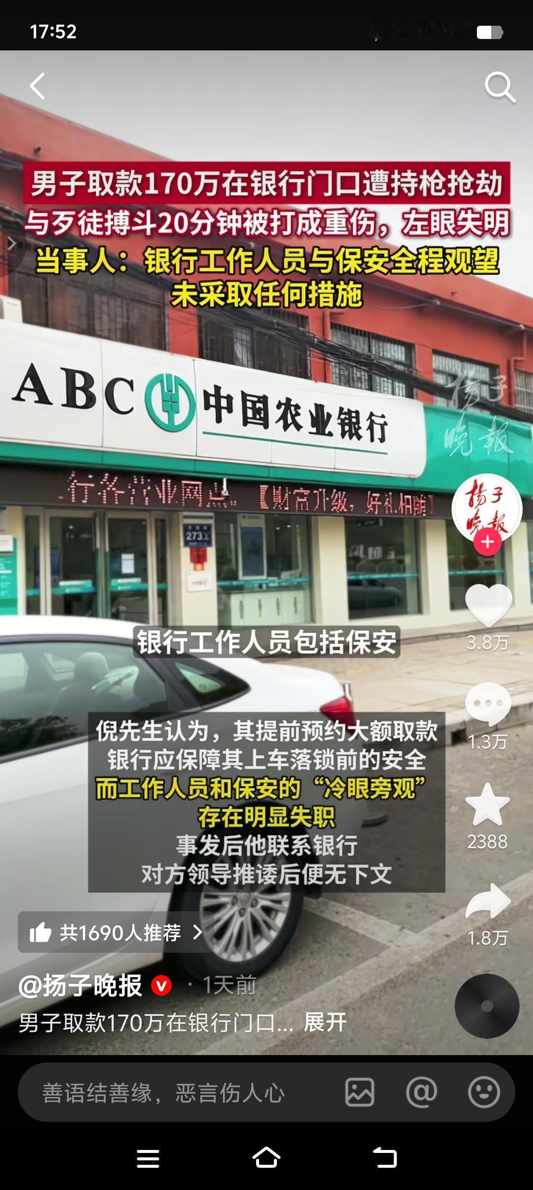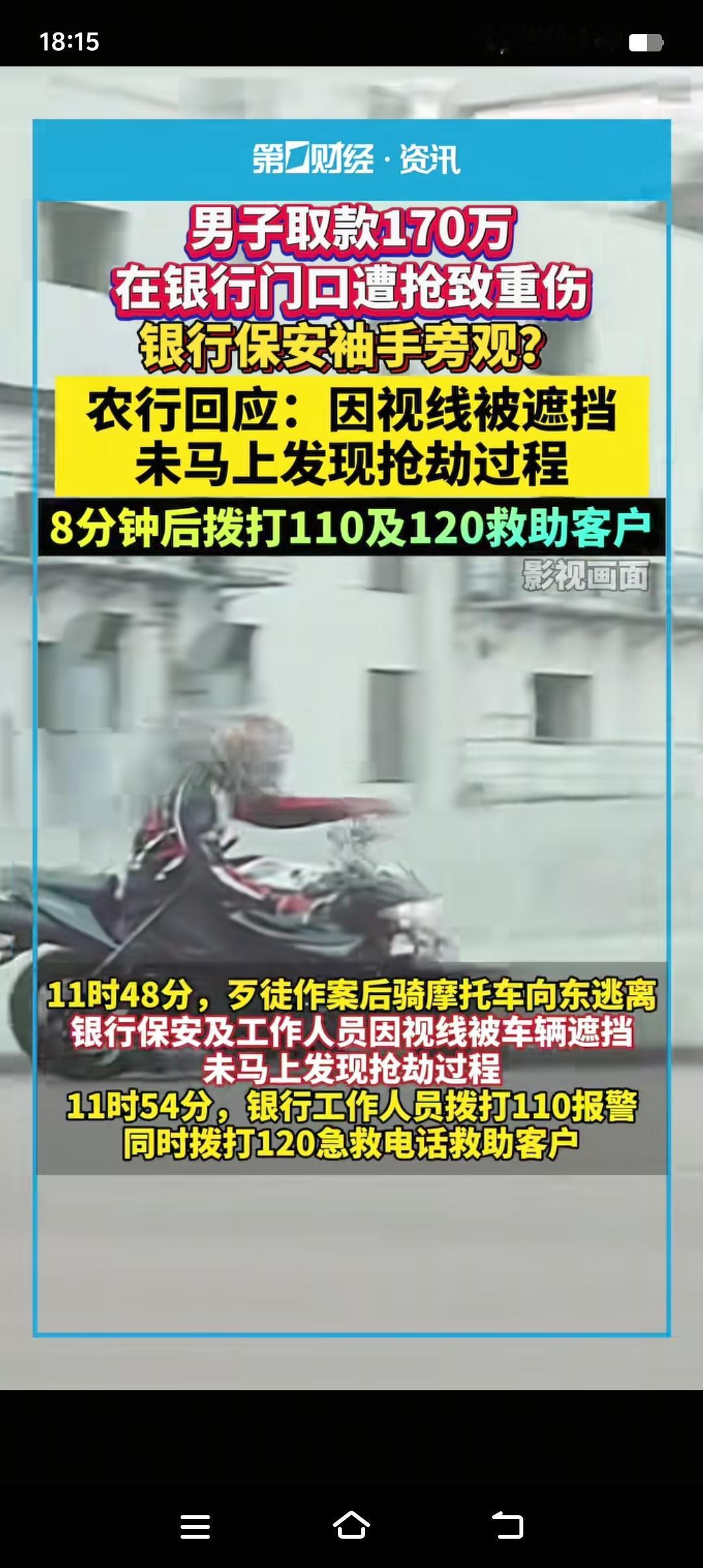 现在才算明白银行那句“现金当面点清,离柜概不负责”的含金量了。 男子取款170万,在银行门口遭抢劫致重伤。银行工作人员和保安全程观望,8分钟后拨打110和120。男子与歹徒搏斗20分钟,钱虽然保住了,但左眼失明,面部重伤。 说句实话,歹徒手持自制枪支抢劫,别说在银行门口,就是在银行里面工作人员和保安也未必敢上前制止,你以为银行的保安是特工,你以为银行的保安是负责客户安全的。只能说该男子太大意了,取170万现金,最起码应该要求银行把自已安全护送到车里。提了个箱子从银行大摇大摆出来,这也太扎眼了吧!不怕一万就怕万一。所以说大家以后去银行取大额现金,一定要多加防范,千万别低估了人性的险恶。