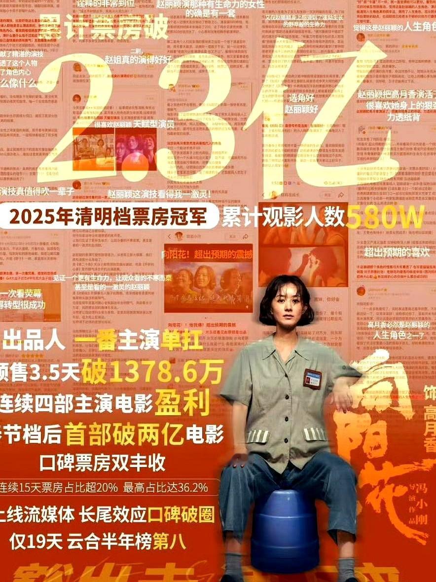 文艺片单扛2.3亿,赵丽颖这步棋走绝了。 她2025年这部《向阳花》,讲乡村教师的故事,豆瓣开分7.9。一个现实题材电影,能拿到这个票房成绩,直接让她冲到年度女演员票房榜第4位,这市场号召力没得说。观众调研里78%的人是冲着“信任赵丽颖选片眼光”去买票的,这个数据很能说明问题。 这成绩最牛的地方在于,近五年单扛票房前20的女演员里,她是唯一一个凭文艺片入围的85后。你看榜一的周冬雨是《燃冬》3.1亿,还有马丽、贾玲这些前辈,个个都厉害。她这个转型路子真的真的稳。 她的电影路走得特别清楚。2023年《第二十条》里当配角,电影票房破了20亿;2024年《虎狼之路》演二番,票房5.8亿。现在《向阳花》单扛成功,验证了她的策略。一步一个脚印。 中国电影协会的专家都说,文艺片单扛破2亿是里程碑,说明好内容有市场。接下来她2026年还有陈可辛导演的《夜行》,搭档是梁朝伟,这资源简直是飞升。 从电视剧到电影,赵丽颖用选片眼光和实打实的成绩证明了自己。