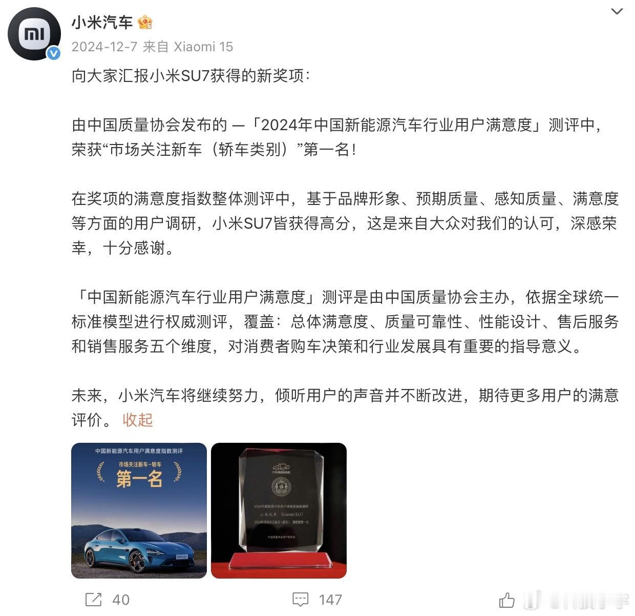 小米 SU7再度登顶“纯电动中大型轿车”用户满意度第一,连续两年霸榜。中国质量协会最新榜单显示,小米 SU7 以满分成绩登顶“纯电动中大型轿车”用户满意度第一,去年它还是以“市场关注新车”身份摘冠,今年直接晋级,硬刚传统豪强并拿下双连冠。当然,这里不要有误解:小米 su7 不是网红爆款,是十万公里实跑零自燃的硬核质量;不是水军刷分,是50万交付用户自己填的满意度问卷;不是参数内卷,是5大维度、20余项指标全满分。从“市场关注新车”到“中大型轿车”双冠,SU7把“传奇耐黑王”打成官方认证。中国品牌第一次在该级别领跑。雷军回应小米SU7再获满意度第一