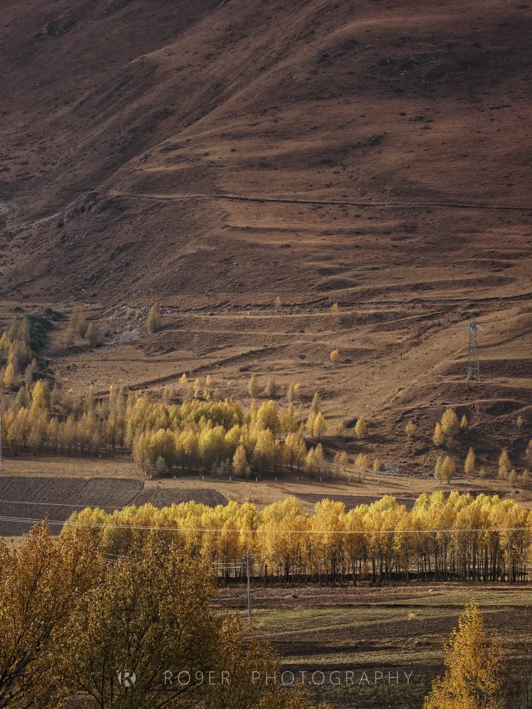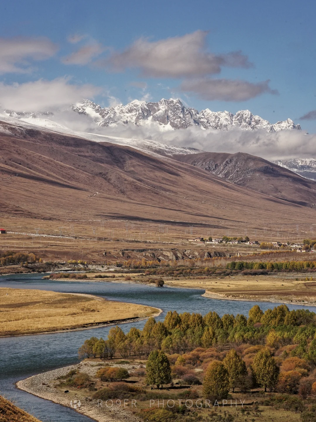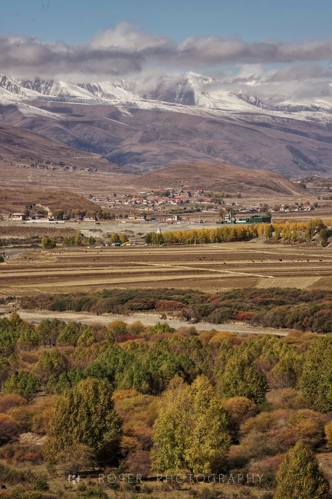 川西那么多景观大道,或是奇伟山峰搭配藏族寺院,或是无边花海点缀碧蓝海子,唯独雪山+田园牧场的组合少之又少,这也是我们特别偏爱甘孜县【百里青稞画廊】的原因。画廊之名,并未过誉,从格萨尔机场到圣康庄园这短短20来公里国道,几乎是一步一停一景的地步,蜿蜒的公路沿着温柔的雅砻江,在卡瓦洛日雪山脚下不断变换着方向,车窗外变幻的景观无时无刻不在刷新眼球,停泊的农机和叼着烟卷的劳作者随时贡献着"世界名画"的场景。在我们心中,虽然深秋时节是它的高光时刻,但不同季节都有各自的美,值得反复前来。