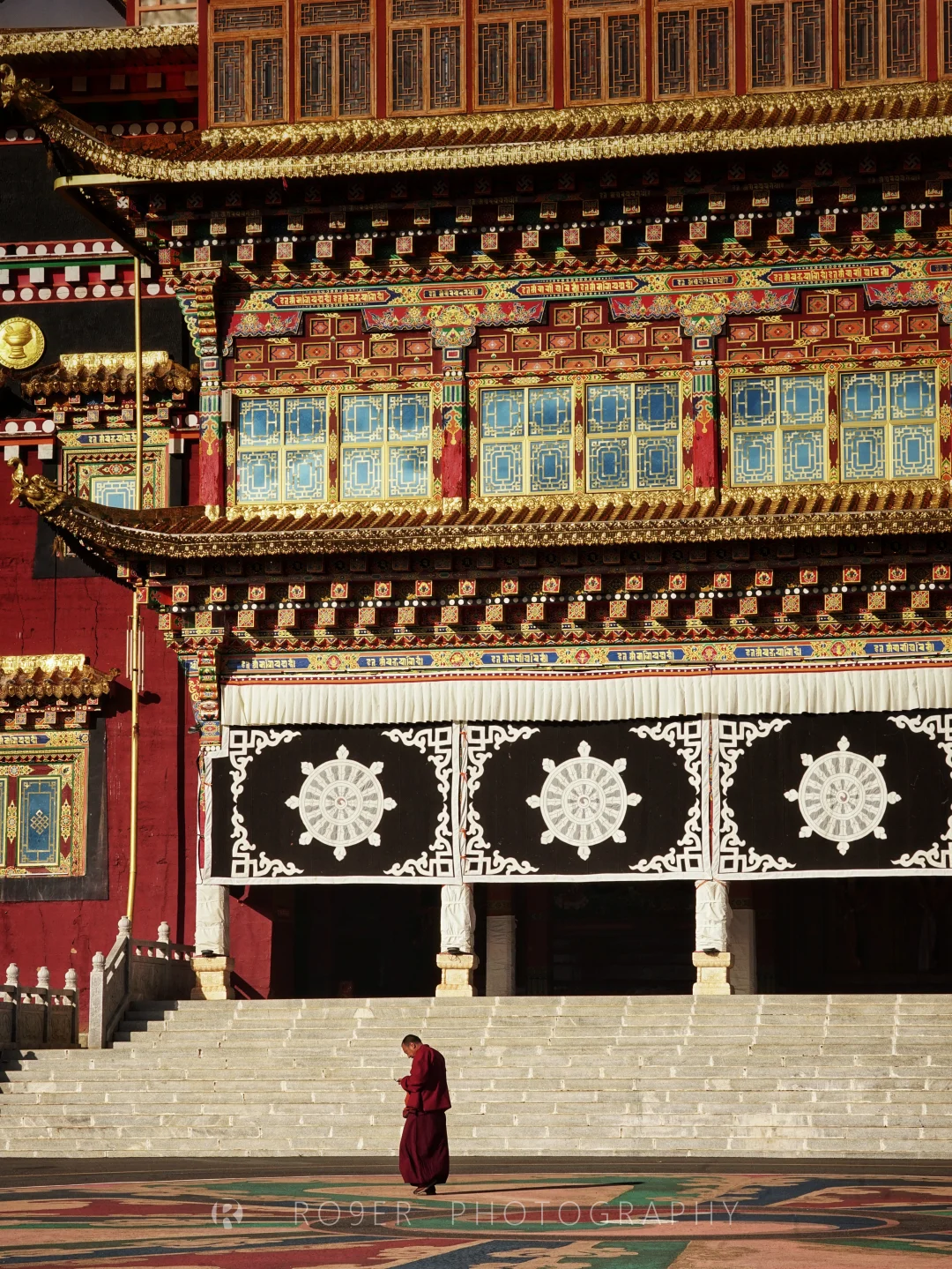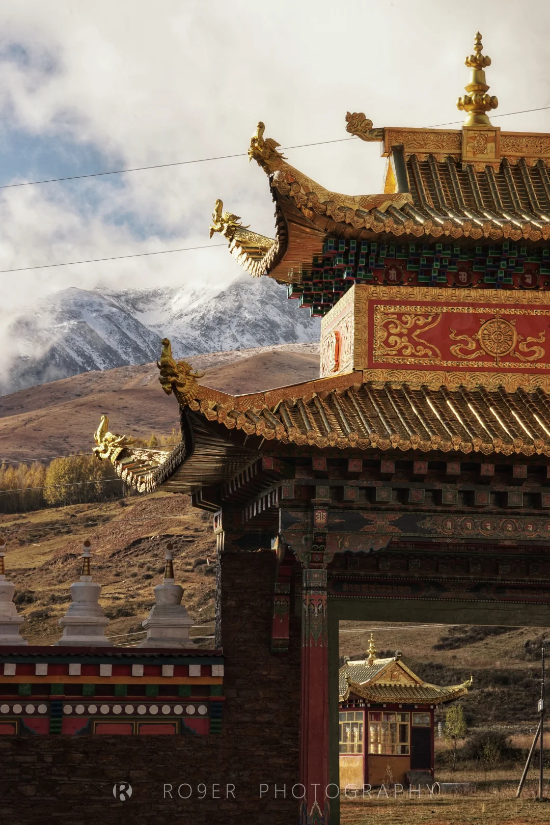 蒙古人早年间被当地称为"霍尔",当年忽必烈之子护送八思巴回藏途径甘孜,从而留下了蒙古人的血脉,其后人大力扶持格鲁派,于是在本地先后修建了13座寺庙,统称"霍尔十三寺",大金寺便是其一,若追其历史,已逾600年。主殿参照拉萨大昭寺所建,形制相仿,内里供奉宗喀巴大师及弟子像,大殿面朝阿拉雪山,视野辽阔