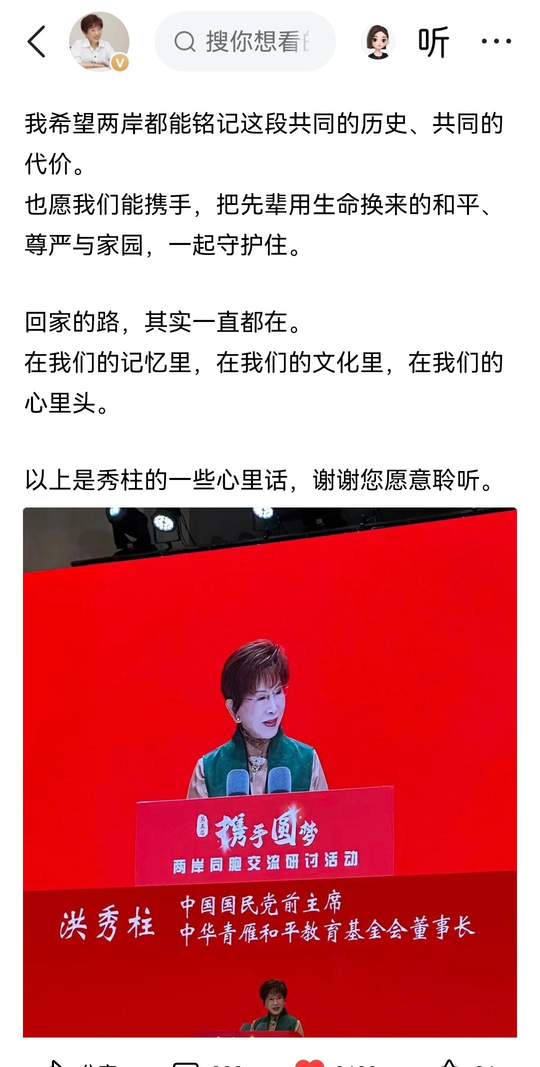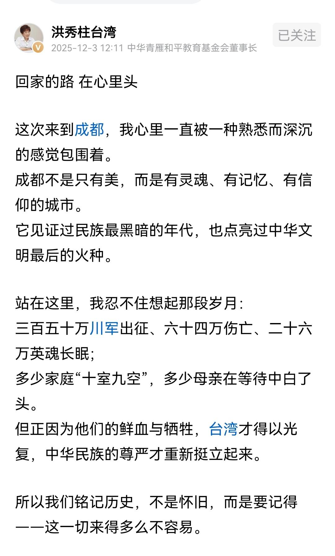 12月3日,洪秀柱女士在头条发布了自己心里话,这是她参加完四川活动后的所感所想。