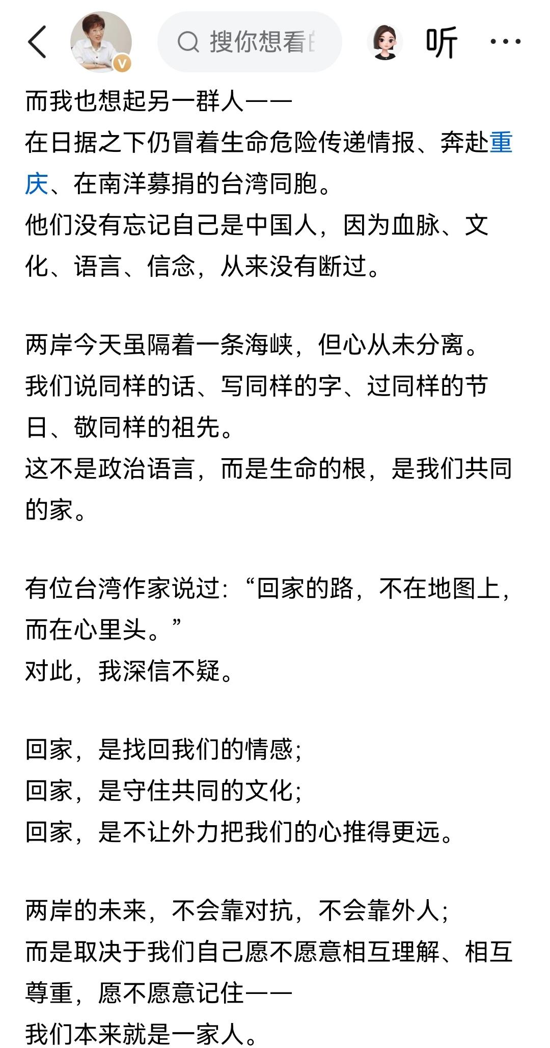 12月3日,洪秀柱女士在头条发布了自己心里话,这是她参加完四川活动后的所感所想。 洪秀柱的这篇小短文题目是《回家的路,在心里头》,四川之行,让她感念川军的伟大,作出牺牲的英魂让人铭记。同时表达了台湾同胞在日据时期做出的贡献。 洪秀柱表达了两岸其实就是一家人,也希望台湾同胞早点回家,她的这篇小短文引发了大家的共鸣。