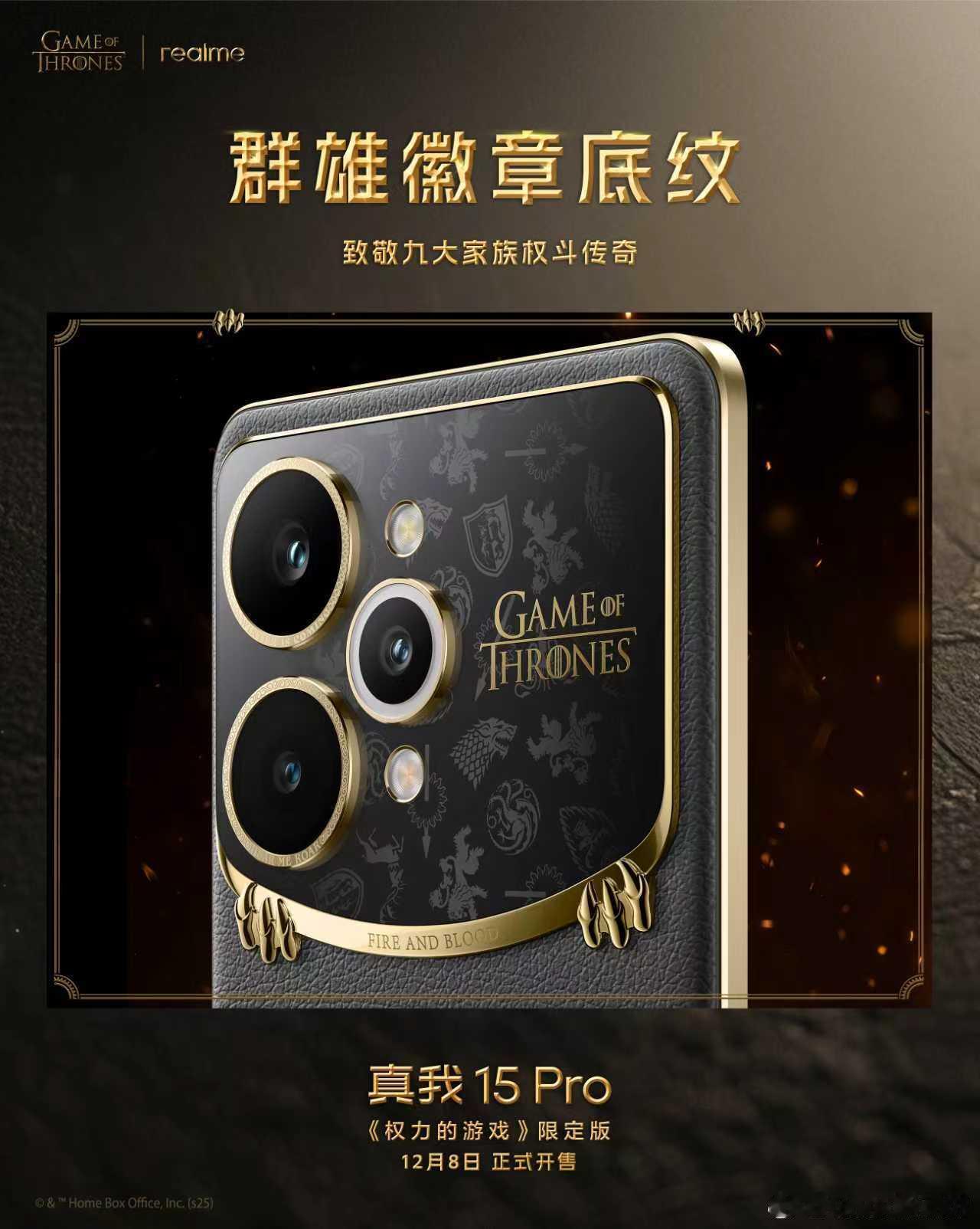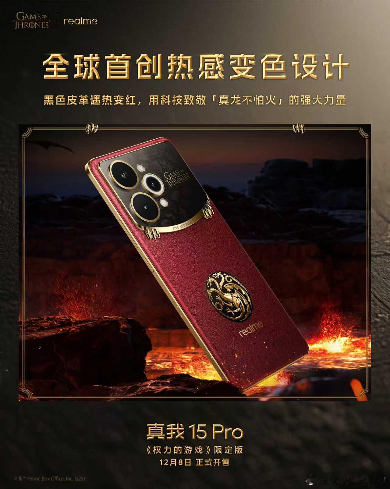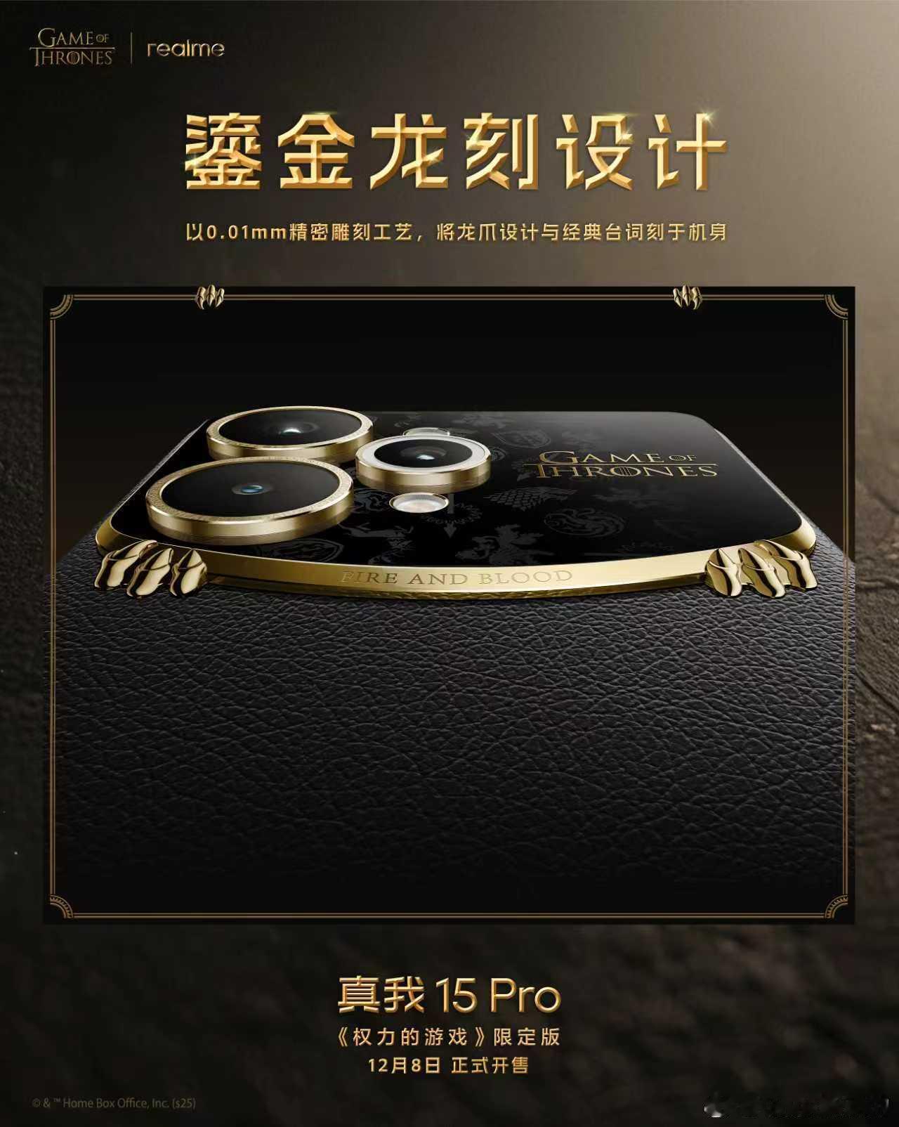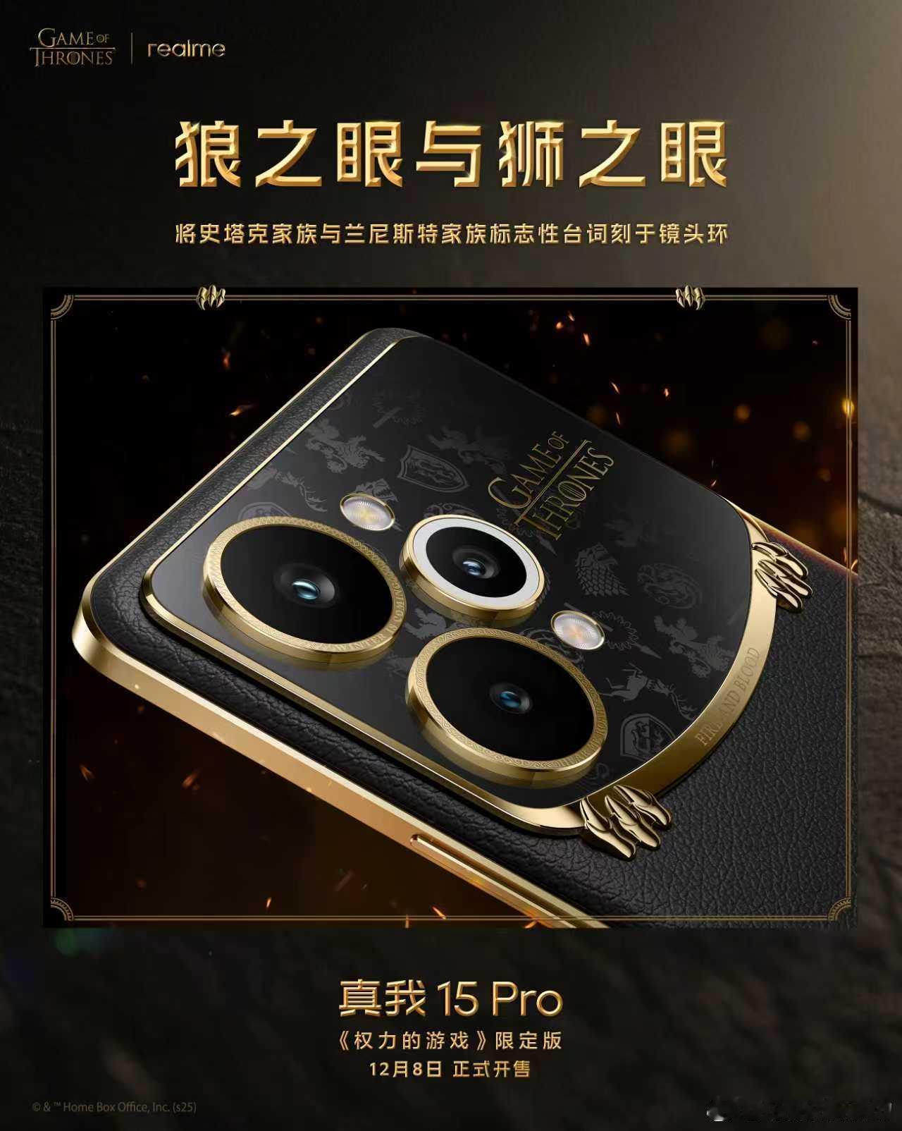 全球首款权游定制机设计细节公布,打造最具典藏价值的《权力的游戏》定制机!-《权力的游戏》史诗金印:将权游经典徽记烙印于机身,彰显独一无二的尊贵印记;-狼之眼与狮之眼:镜头环铭刻史塔克家族与兰尼斯特家族经典台词,承载家族符号与史诗质感;-群雄徽章底纹:九大家族徽章暗纹Deco,复刻家族间的权斗传奇;-鎏金龙刻设计:0.01mm精密雕刻龙爪与经典台词,每一次触碰犹如宣示对铁王座的主宰;-坦格利安家族徽章:以纳米级雕刻技术,复刻坦格利安千年权力的象征;-全球首创热感变色设计:首次将温变粒子融入皮革材料,黑色皮革遇热变红,致敬经典名场面;真我15Pro权力的游戏限定版 将于12月8日限量发售,更多定制内容也将逐步揭晓。