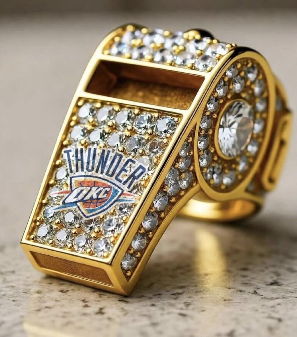 追梦不干了,咆哮着找裁判说理,嘴里也“念念有词”,但最后也没人理他。再看慢镜头,格林愤怒也不无道理,只是SGA和裁判不会理睬他的。如果说触碰到手了有可能,但小臂位置还是干干净净的。 图中镶钻的哨子很经典:雷霆总冠军! 追梦格林