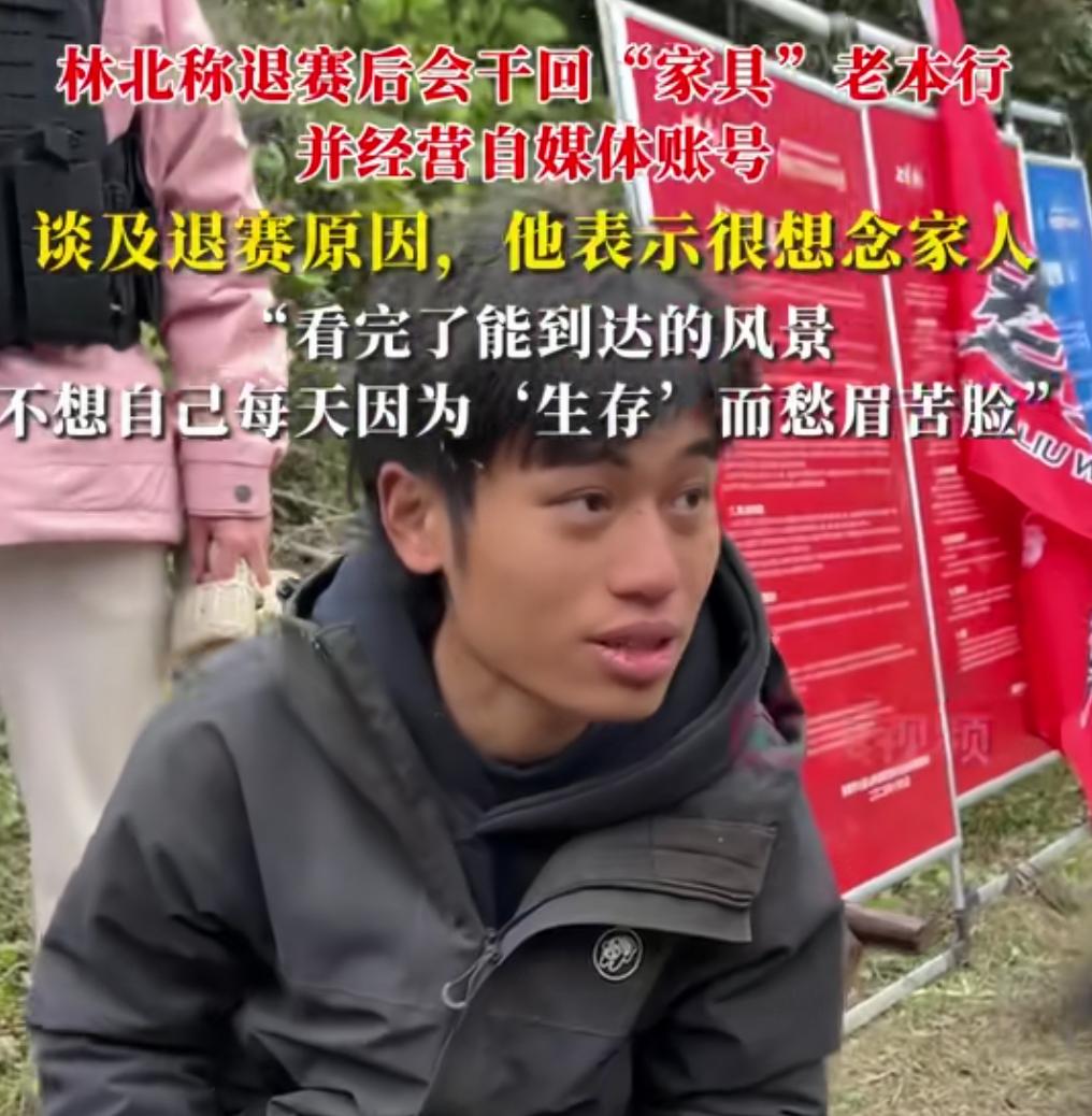 荒野求生林北主动退赛了,下山的时候举着旗帜活蹦乱跳的,是一种状态的解脱,是一种情绪的释放。 林北不愧是大学生,谈及退赛的原因,逻辑清晰层次分明: 第一、是特别想念家人,想尽快回到他们的身边。 第二、很多想涉足的风景,能达到的风景,已经看到了,知足。 第三、坦言自己是个荒野小白,在这活下去很容易,但是活好很难。不希望精神状态是每天愁眉苦脸,更希望每天是一个精神饱满,永远带给大家快乐的一个人。 是像有文化的人,尤其是第三点,直接把个人境界提升了一个高度,说明他真的是悟到了。在完成了心愿之余,还能在比赛中给人传达一种积极乐观,快乐向上的精神。 同时他也很善良,曾说过其他人都是有家室的人,他们更需要哪笔冠军奖金,压根他都没有想过夺冠,黑他的那波人可以闭嘴了。 林北满身泥污却眼里有光,低调谦和笑着坚持比赛,而今清醒退场,这样的人生态度,值得很多人学习! 荒野林北 林北求生名场面