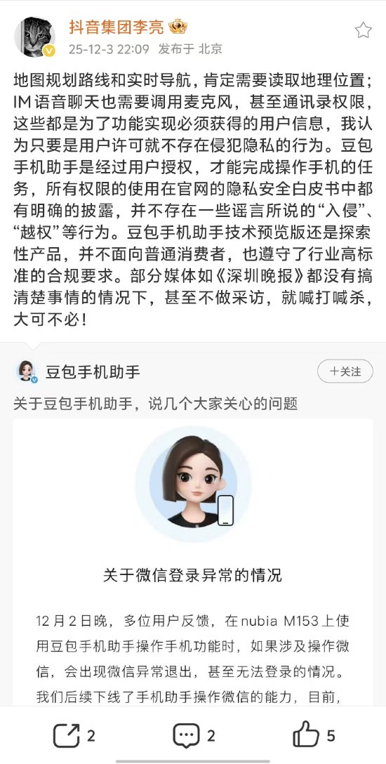 他强调,豆包手机助手是经过用户授权,才能完成操作手机的任务,所有权限的使用在官网的隐私安全白皮书中都有明确的披露,并不存在一些谣言所说的“入侵”、“越权”等行为。豆包手机助手技术预览版还是探索性产品,并不面向普通消费者,也遵守了行业高标准的合规要求。部分媒体如《深圳晚报》都没有搞清楚事情的情况下,甚至不做采访,就喊打喊杀,大可不必。