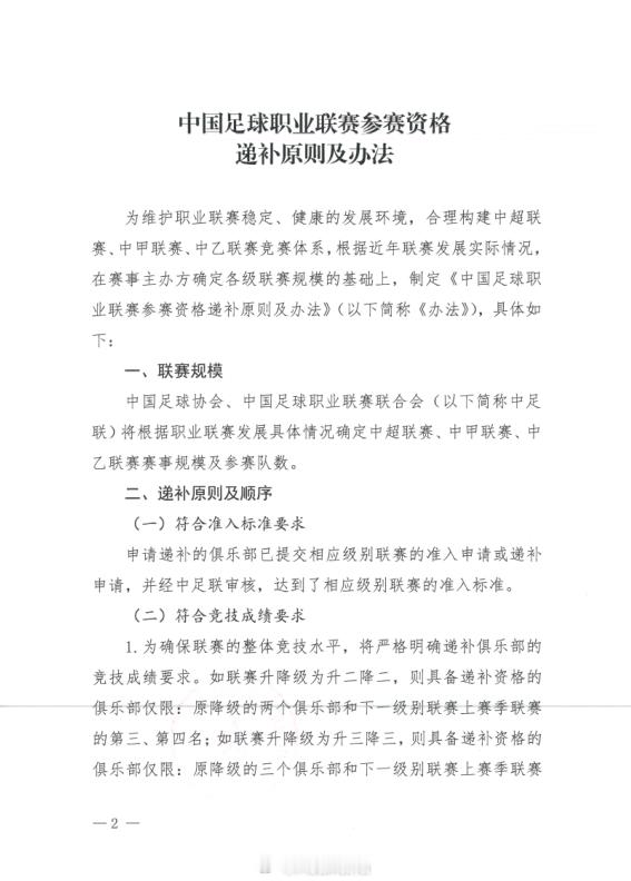中足联发布了新修订的《中国足球职业联赛参赛资格递补原则及办法》,该文件取代了20