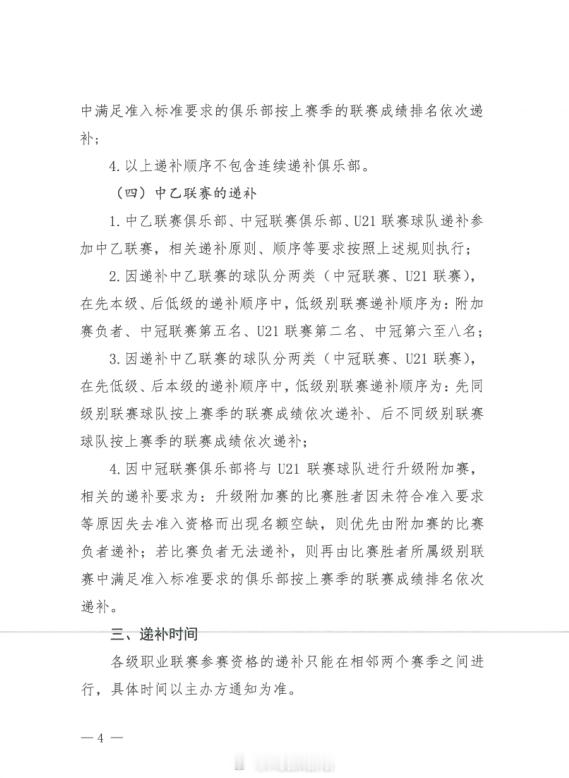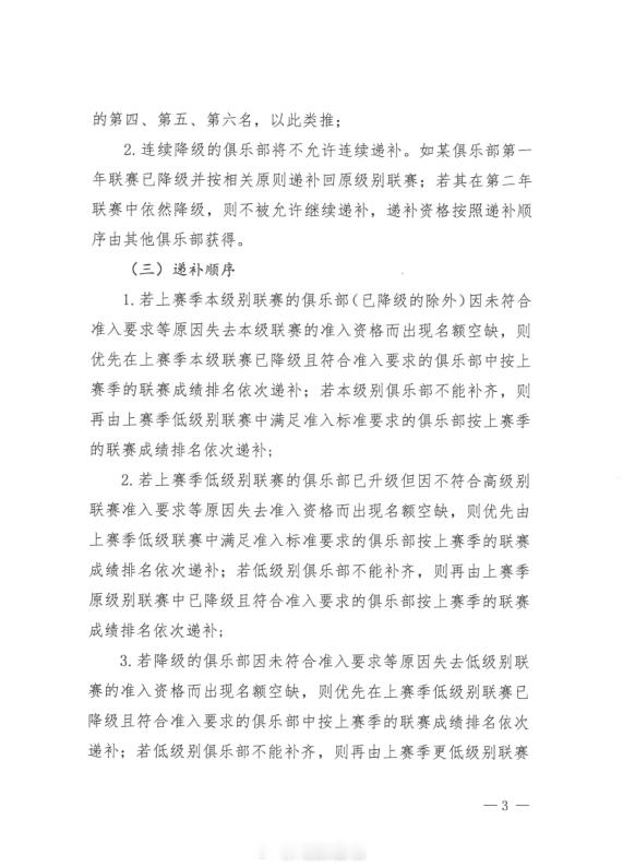 中足联发布了新修订的《中国足球职业联赛参赛资格递补原则及办法》,该文件取代了2023年中国足协发布的《中国足球协会职业联赛参赛资格递补原则及办法》。主要变化部分:1、明确了降级到低级别的俱乐部退出的情况下,低级别联赛采取先本级、后低级的原则递补。2、明确了中乙联赛递补顺位为:(1)先本级、后低级的情况下:附加赛负者、中冠5、U21联赛2、中冠6-8;(2)先低级、后本级的情况下:先同级别依次递补、后不同级别球队依次递补。3、明确递补申请和审核的材料要求。