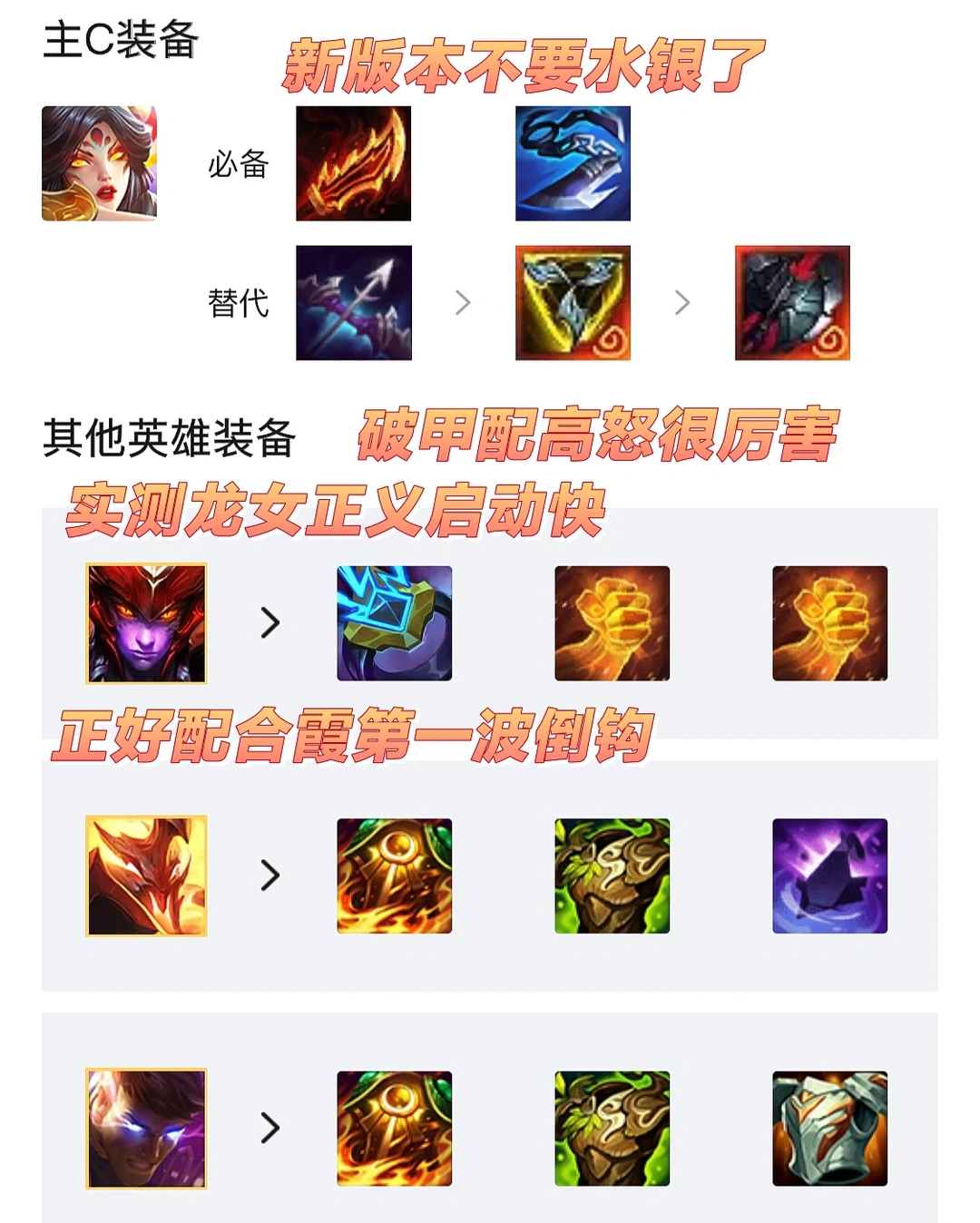 霞羊刀是必备的,其次是巨杀和轻语,这个版本轻语加强了,高怒配轻语破甲太实用了。龙女是后期的关键牌,最近玩的比较多,正义不管打同行还是外敌,可以提前启动配合霞打一波高爆发。
