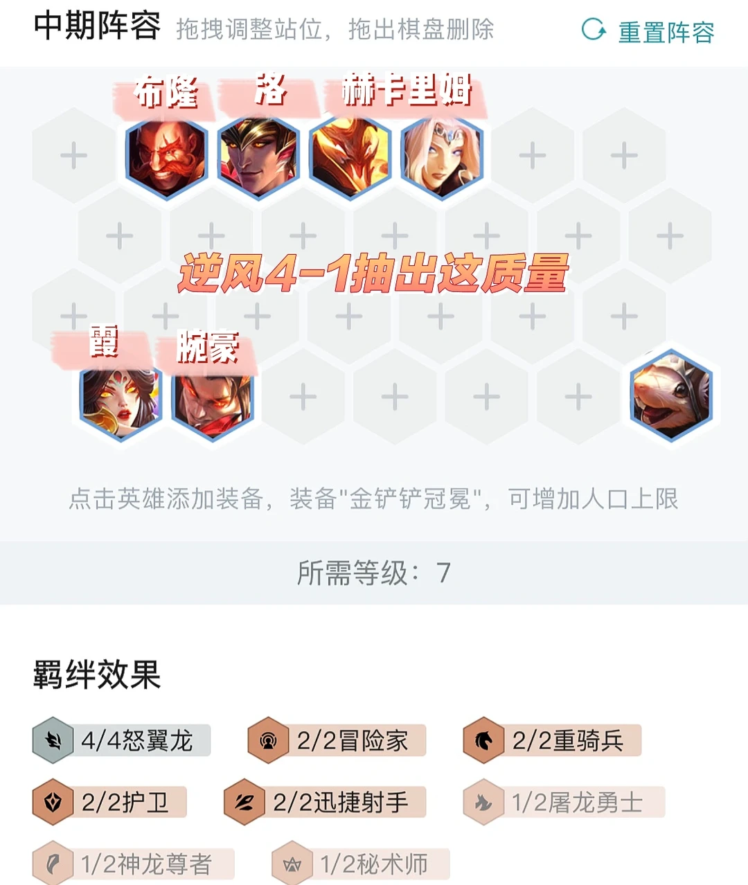 逆风4-1抽出其他低费基础牌二星和一张霞、人马,血量特别低可以7级抽出二星再上8都行。