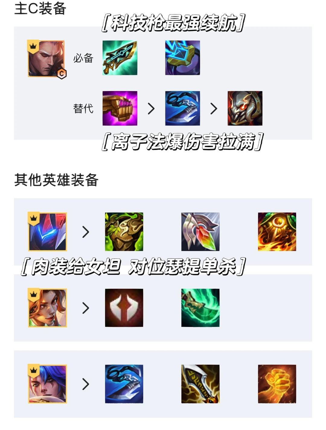 [草莓R]装备思路:佛爷现在优先科技枪离子火花,科技枪这个装备除了能回自己血之外,福牛本来残血就不死,搭配科技枪奶队友的效果很多时候能起到奇效,离子和法爆则是输出最大化。