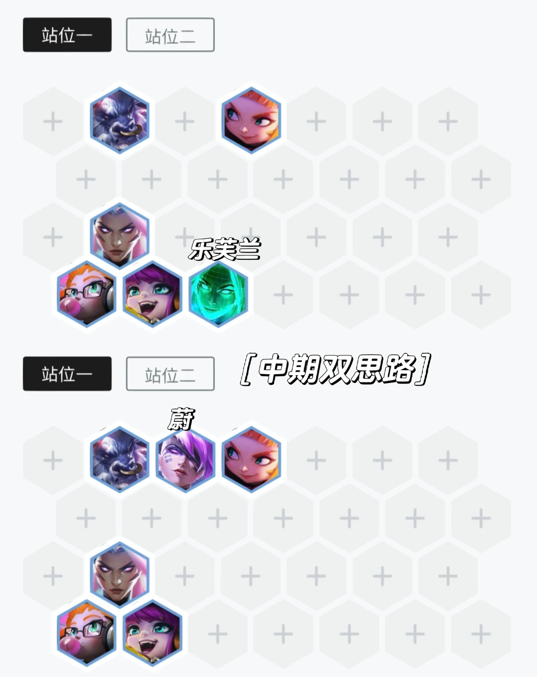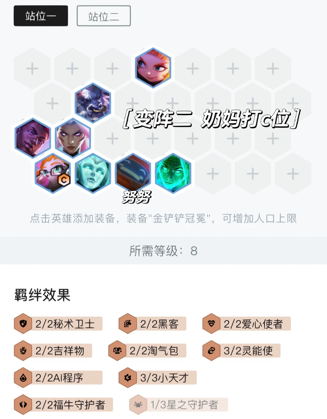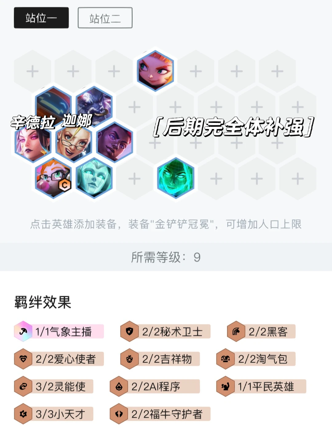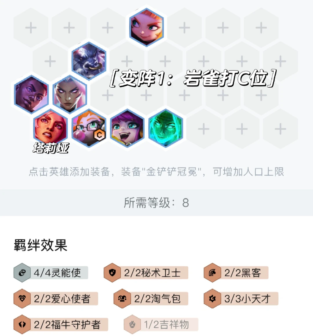 后期根据海克斯和英雄强化灵活变阵,可以上9拼多多橙卡,也可以8人口选择奶妈或者岩雀当C位都OK。
