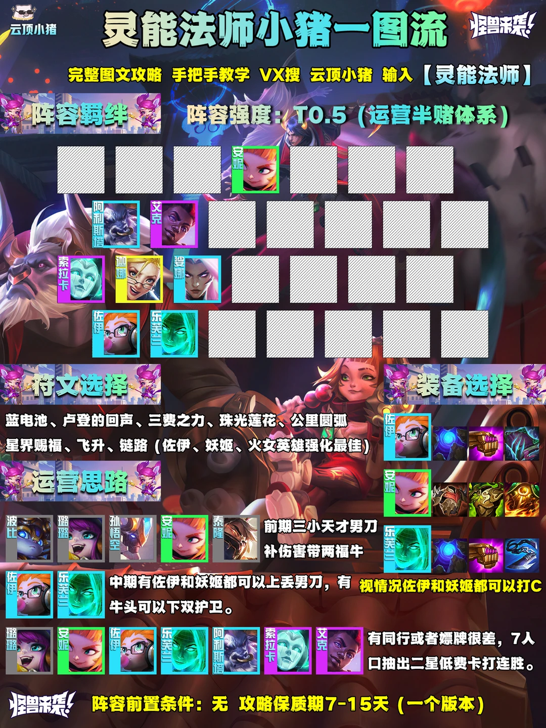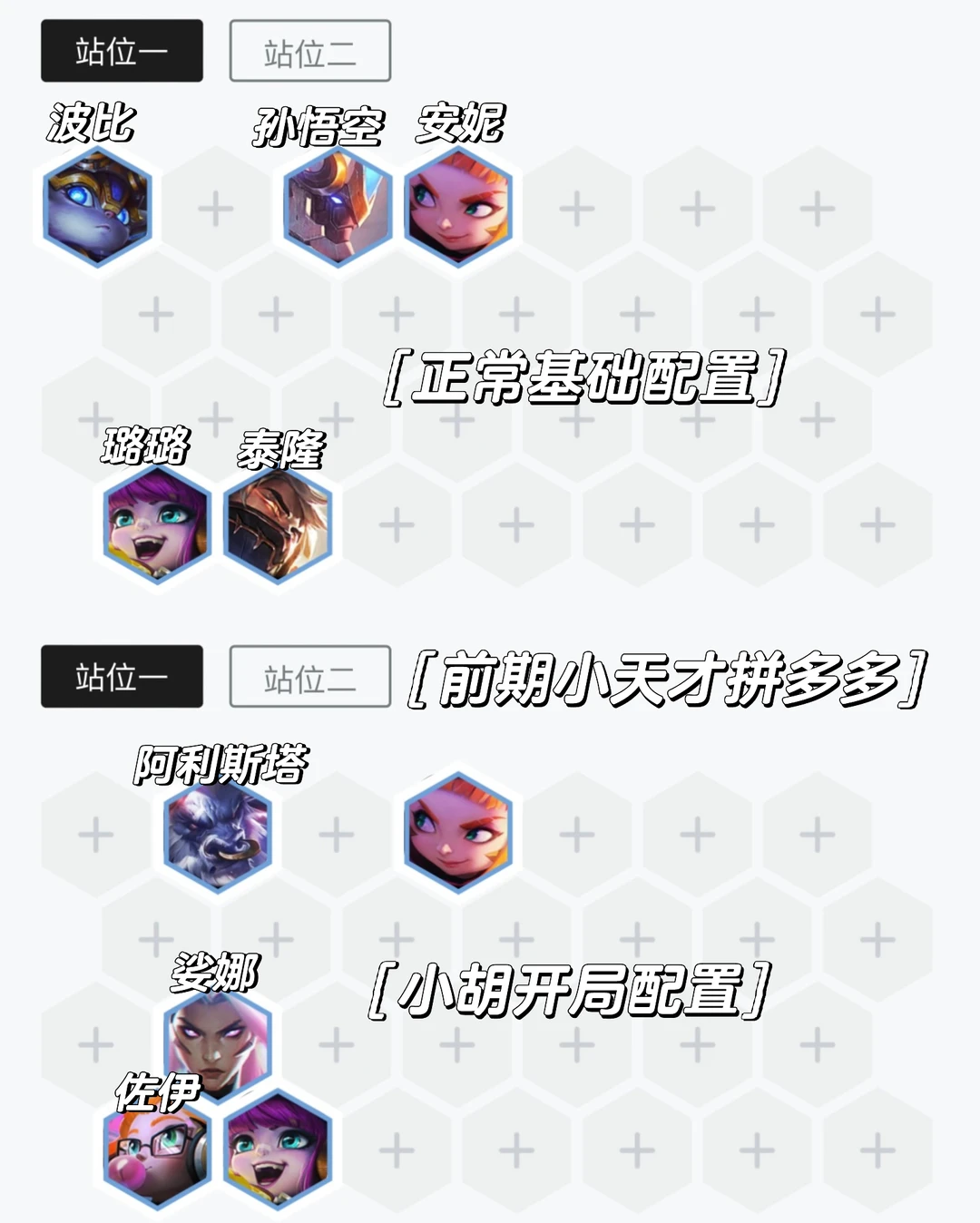 前期小天才拼多多过渡,比较胡能爆出或者嫖到佐伊乐芙兰最佳,没有则用男刀当C配合安妮二福牛也是比较好连胜的,具体看嫖牌的情况可以灵活选择其他阵容搭配也行,连胜优先。