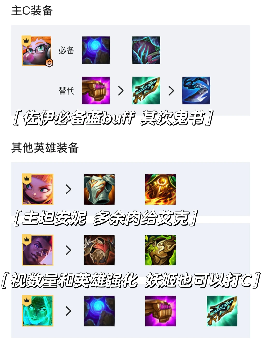 ✨装备思路:佐伊必备蓝BUFF核心装备其次鬼书,然后找火女的前排装至少两件,佐伊和妖姬都可以打C位具体看数量和英雄强化吧,能三星的给装备,都不能三鬼书偏佐伊爆发装偏妖姬,后期找肉装给艾克增强坦度。