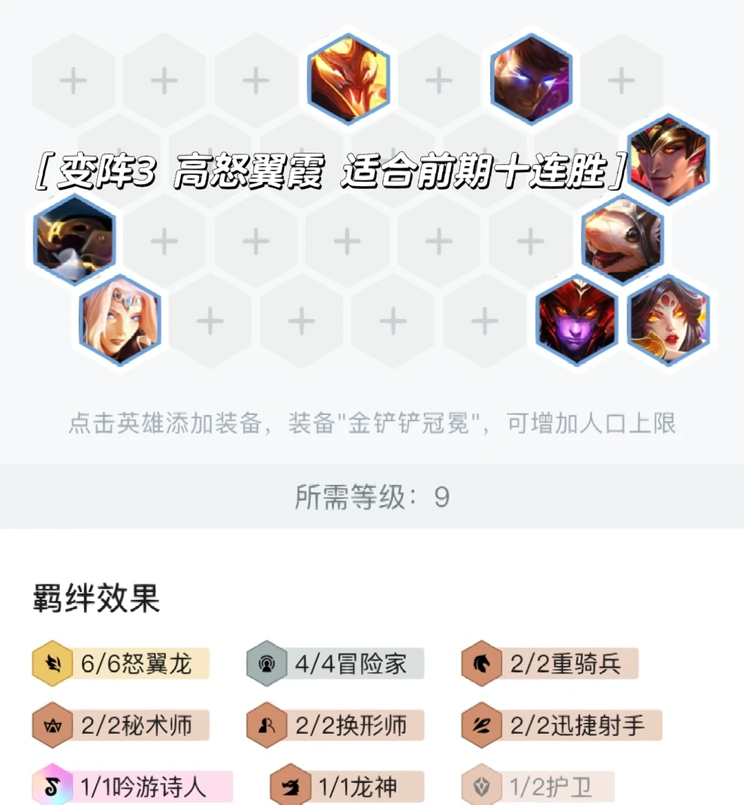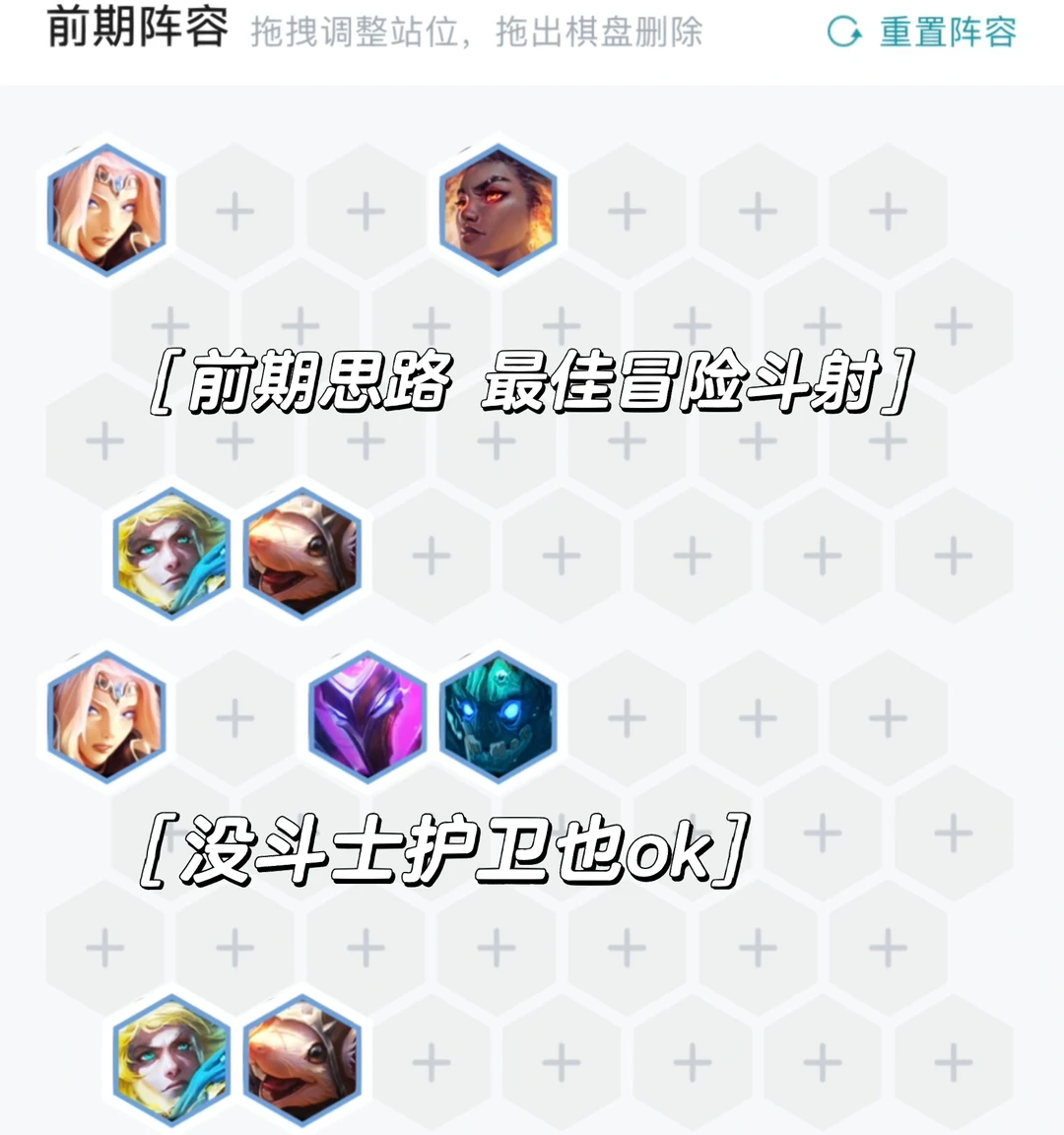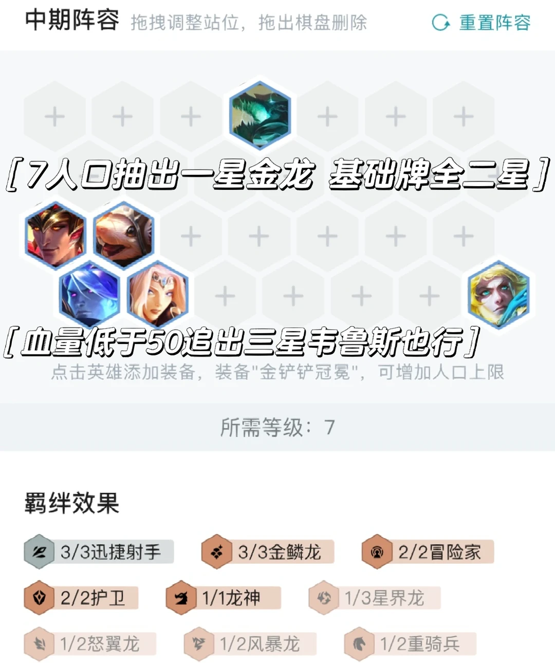 前期还是用冒险斗士射手过渡,用其他的经济会比较差。过渡到7人口直接开始抽牌,需要抽出一张金鳞龙和基础牌全部二星之后上人口,如果血量特别低也可以再7人口追出三星韦鲁斯再上人口。