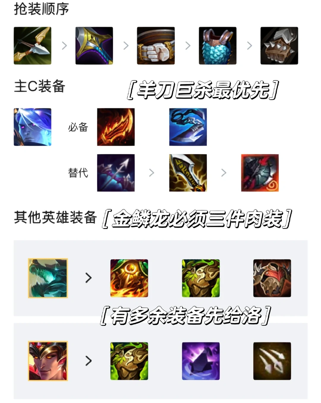 装备思路:韦鲁斯最先做出羊刀加巨杀,然后补无尽或者黑切三项,没有轻语也不错。金鳞龙三件肉装拉满,剩余肉装给到洛,其他看情况分配即可。