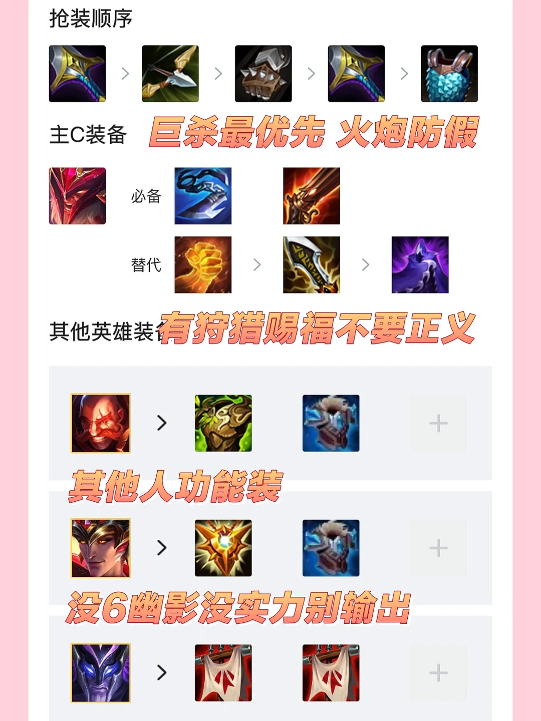 [开箱R]装备思路:拉夫火炮是避免假赛!巨杀性价比最高,第三件有续航符文可以直接做夜刃或者无尽。其他人功能装优选,潘森不要做输出,没高幽影就是玩具。