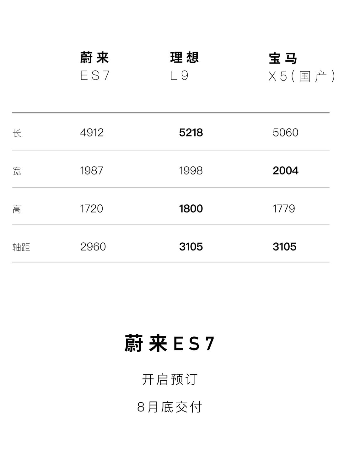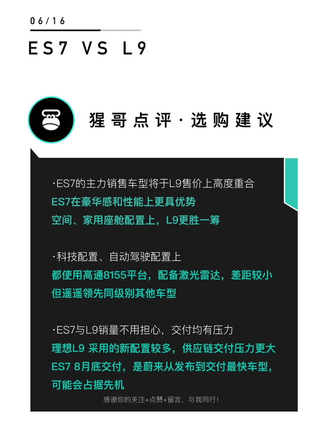 💰ES7的主力销售车型将于L9售价上高度重合 ⭐️ES7在豪华感和性能⚡️上更具优势 👪空间、家用座舱配置上,L9更胜一筹 🤖科技配置、自动驾驶配置上 都使用高通8155平台,配备激光雷达,差距较小 👆🏻但遥遥领先同级别其他车型 ES7与L9销量不用担心,交付均有压力 理想L9 采用的新配置较多,供应链交付压力更大 ES7 8月底交付,是蔚来从发布到交付最快车型,可能会占据先机