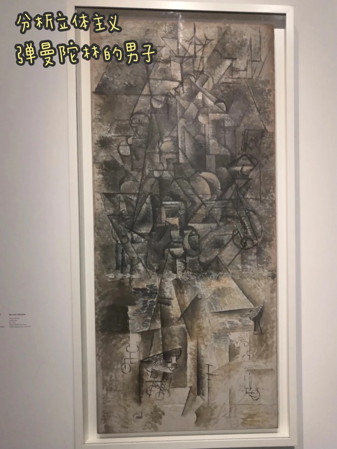 《弹曼陀林的男子》是分析立体主义的巅峰作品。画布底部的一些图案让人想到弦乐器上凸花装饰,而圆形则让人联想起乐器的轮廓和音孔。