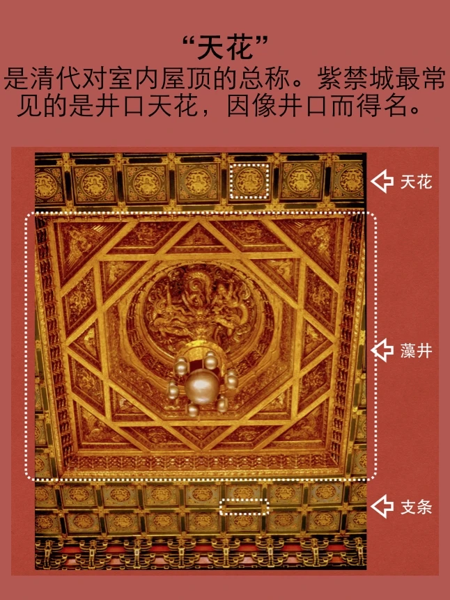 天花是清代对室内屋顶的总称。它的做法是先在梁间用支条搭成方格网,再在方格空隙处镶一块块天花板,板上按照不同建筑等级绘制龙凤彩画。