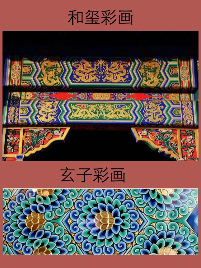 金龙和玺画是清代彩画最高等级。主要特点是彩画大线呈横W型,画面中满绘各种龙纹,均为沥粉贴金,使用的两色金箔含金量达到98%的库金和74%的赤金。