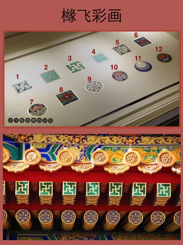 旋子彩画等级低于和玺彩画,常见于宫中次要建筑。主要特点是大量使用旋子纹饰,中心为旋眼,像开放的花瓣。