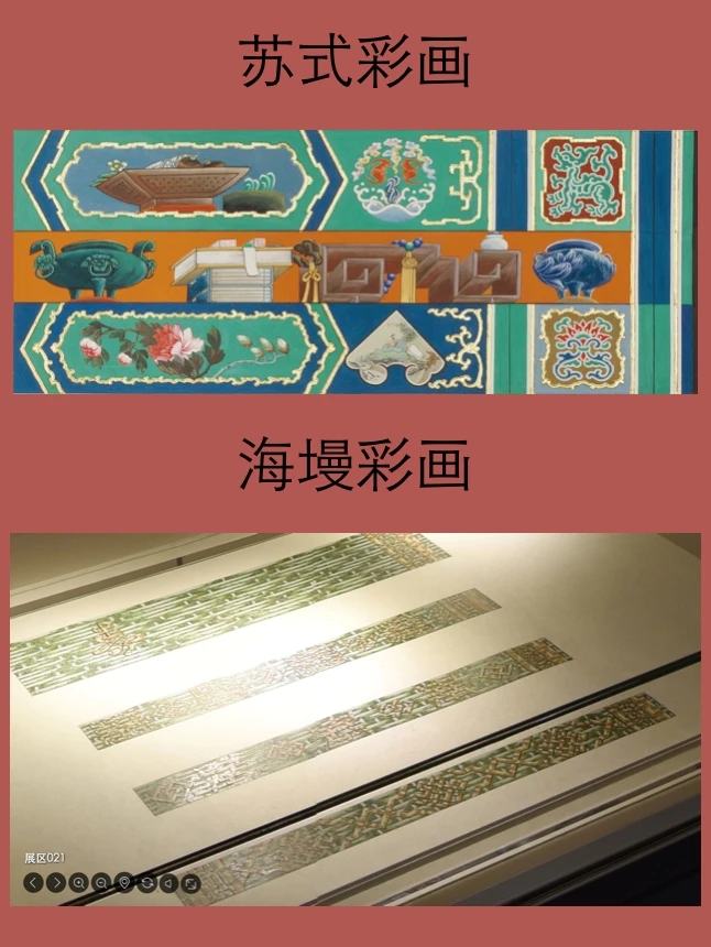 明代永乐年间修建紫禁城时大量征用江南工人,苏氏彩画由此传入北方。由于题材广泛,山水花鸟、人物故事无所不有,苏氏彩画常被用于园林和生活区。